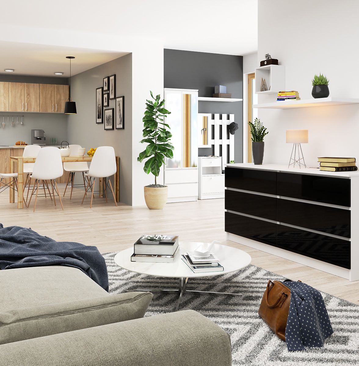 - Korpus komody vyrobený z laminovanej dosky biely mat 16mm odolnej proti oderu