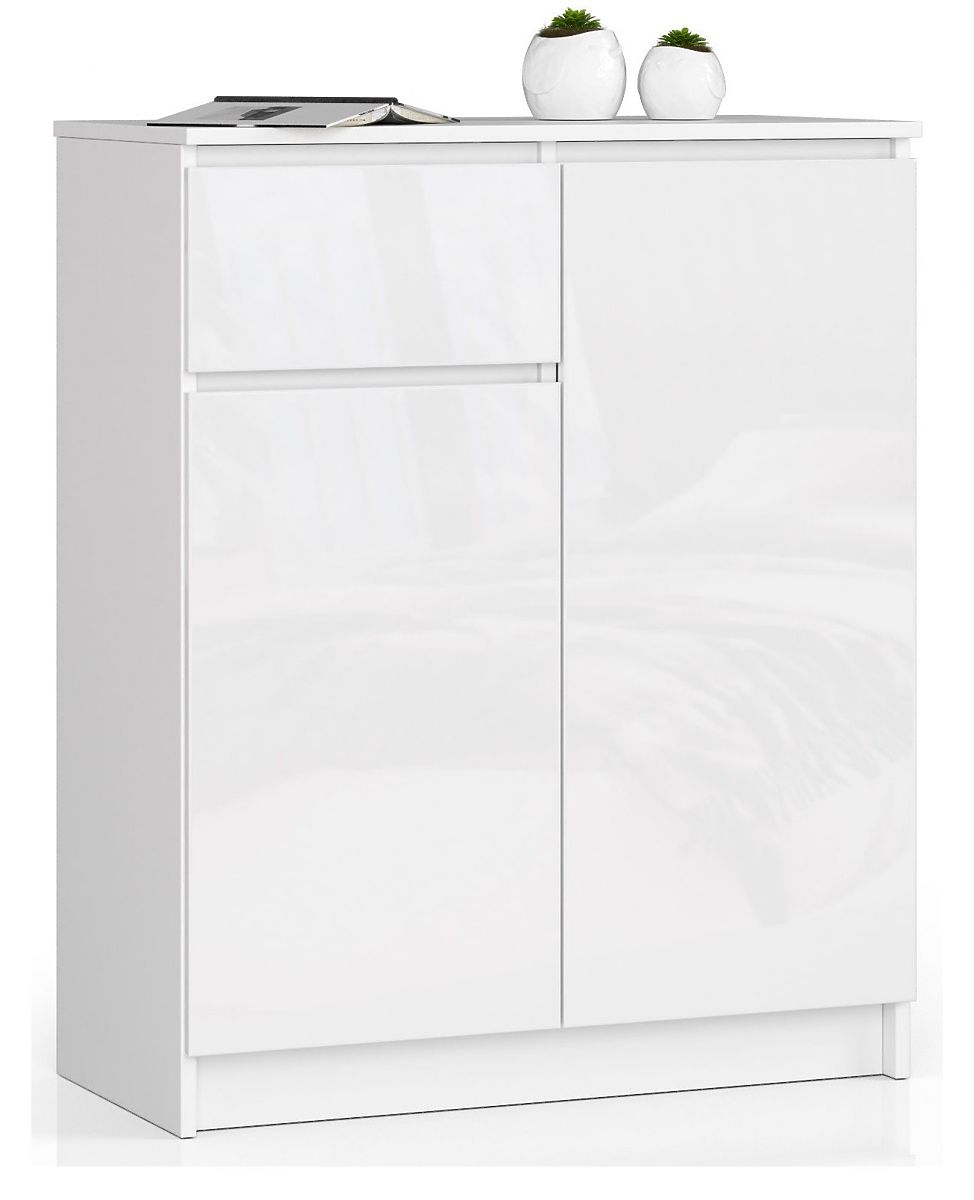 Malá biela komoda je vybavená praktickou zásuvkou a dvoma uzavretými skrinkami - v každej z nich sú dve police. Nábytok sa vyznačuje pevnou konštrukciou a precíznym spracovaním. Prezentovaná ponuka poteší oko a spĺňa očakávania aj tých najnáročnejších zákazníkov z hľadiska funkčnosti. Komoda K 80 cm je kombináciou bieleho korpusu s čelnými plochami s vysokým leskom v rovnakej farbe. Vkusný nábytok sa bezpochyby bude skvele vynímať v mnohých interiéroch zariadených v škandinávskom, minimalistickom alebo modernom štýle.