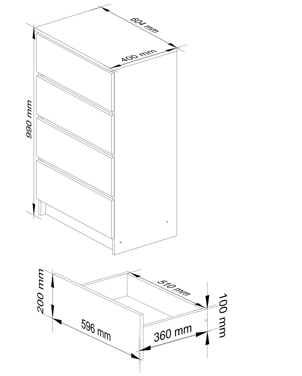 KOMODA K60 4 ZÁSUVKY Vyrobená z 16mm laminovanej dosky odolnej proti oderu.