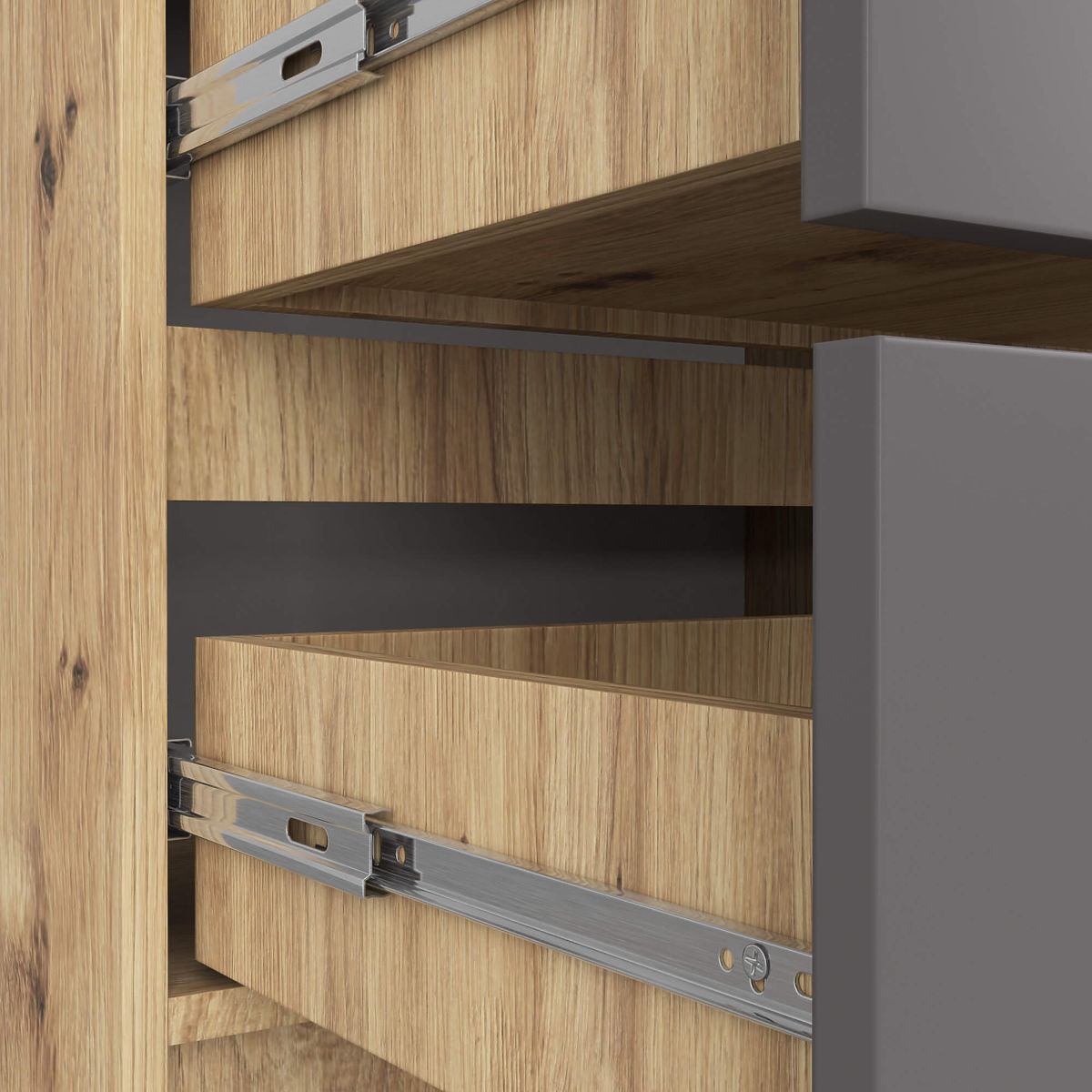 Hrany olepené ABS hranou MIX FARIEB KORPUS DUB ARTISAN / ČELÁ GRAFIT ŠEDÁ