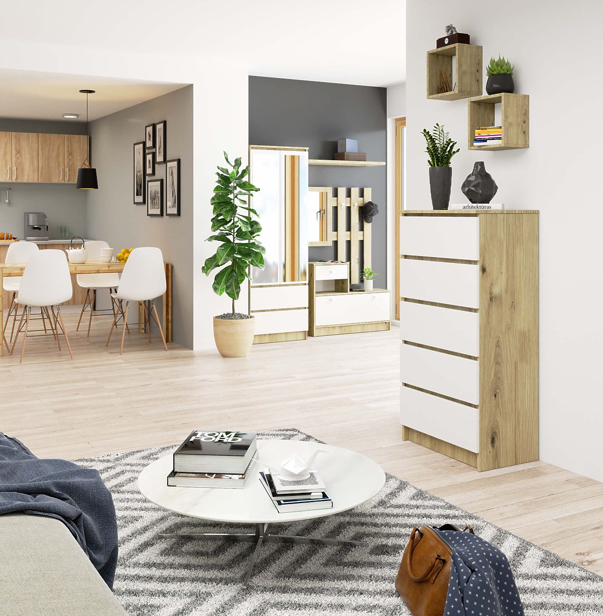 Komoda s 5 zásuvkami z laminovanej dosky, farba Dub Artisan a Biela. .. viac