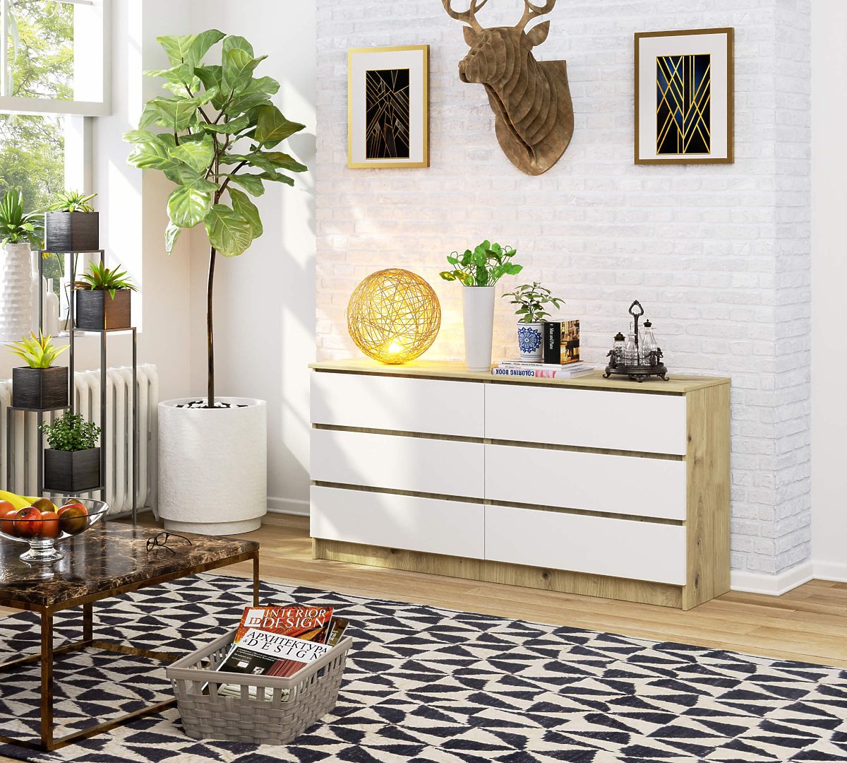 Komoda do obývacej izby K 160 cm je nábytok vybavený šiestimi priestrannými zásuvkami. Kombinácia dubu artisan s nesmrteľnou bielou viedla k vytvoreniu nábytku, ktorý sa dokonale hodí do mnohých rôznorodých interiérov. Nájde uplatnenie v spálni, obývacej izbe, študentskej izbe aj kancelárii. Komoda bude ladiť s miestnosťami zariadenými v minimalistickom, modernom, škandinávskom, retro aj loftovom štýle. Je to dokonalá kombinácia jednoduchosti a elegancie, ktorú ocenia aj tí najnáročnejší.