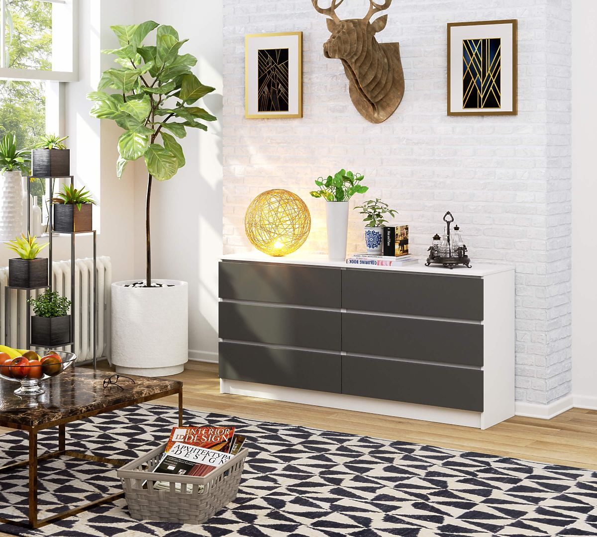 Komoda s bielym a grafitovo šedým dizajnom a šiestimi zásuvkami. .. viac