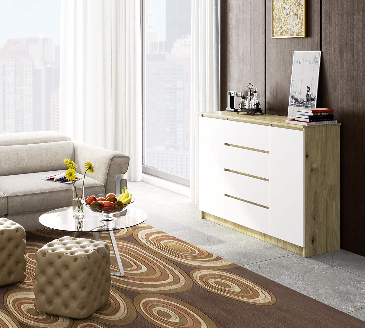 Komoda s dvoma dverami a štyrmi zásuvkami z laminovanej dosky. .. viac