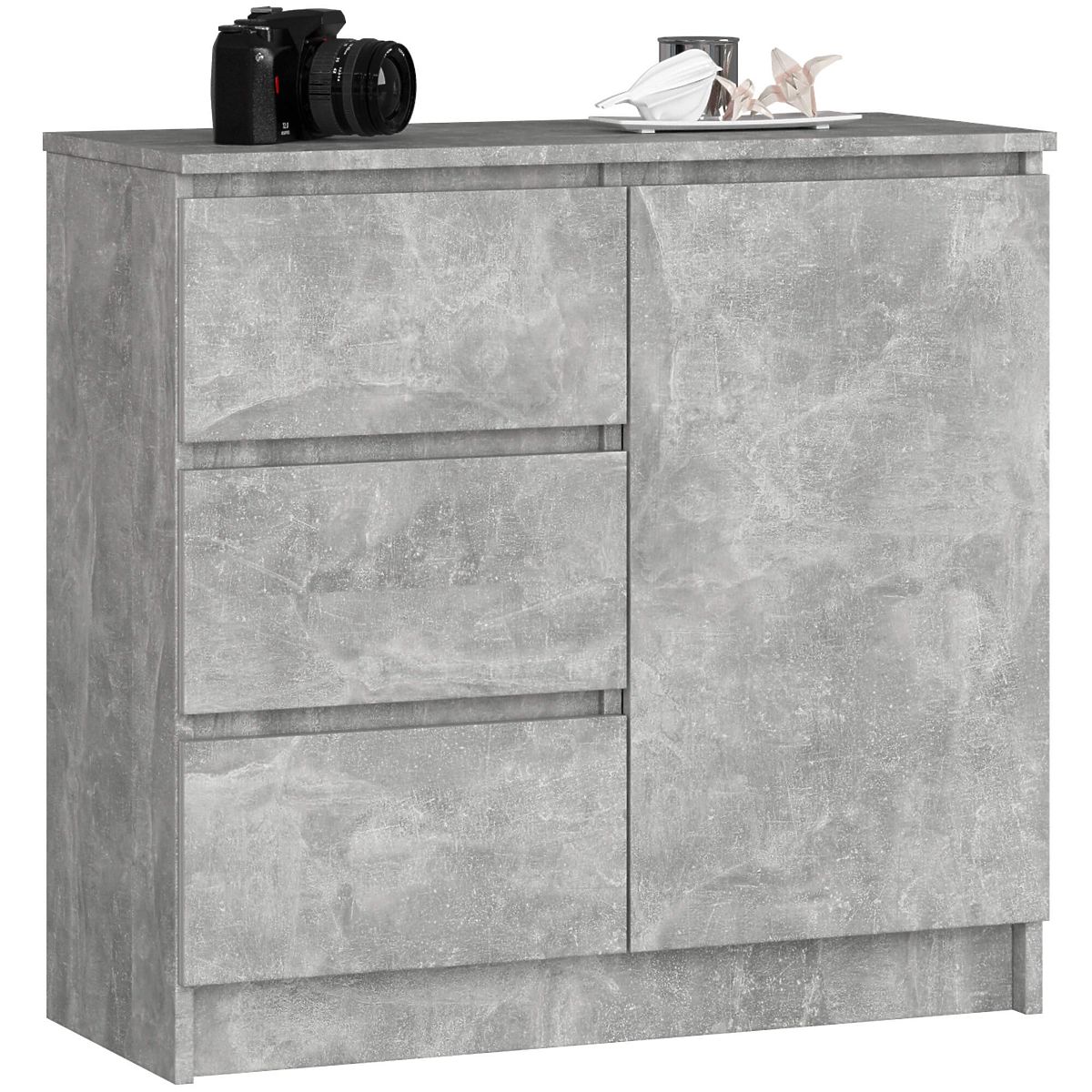 Malá komoda je prvok vybavenia, ktorý nájde uplatnenie v každej miestnosti. Moderné farby, pevná konštrukcia a starostlivé spracovanie viedli k vzniku skrinky, ktorá sa osvedčí napríklad v predsieni, obývacej izbe alebo študentskej izbe, ale aj v spálni. Môže byť využitá aj v kancelárskych priestoroch, kde umožní ukladanie mnohých dokumentov a ďalších kancelárskych potrieb. Komoda sa skladá z jedných dverí (vnútri sú dve police) a 3 zásuviek. Nábytok kombinuje betónovú farebnosť.