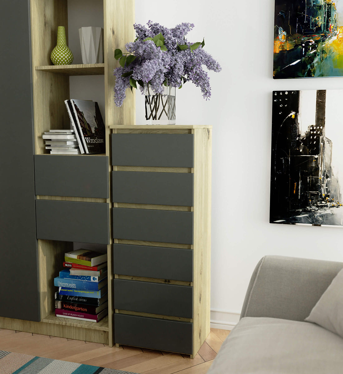 KOMODA CL6 6SZ DUB ARTISAN / GRAFITOVÁ ŠEDÁ