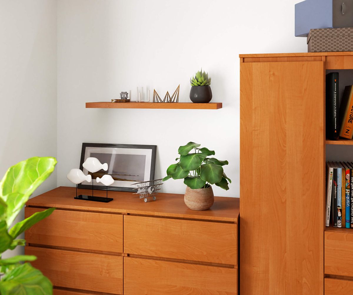 Vyrobená z laminovanej dosky odolnej proti oderu. Hrany sú opatrené melamínom. V balení sú neviditeľné nástenné úchyty.