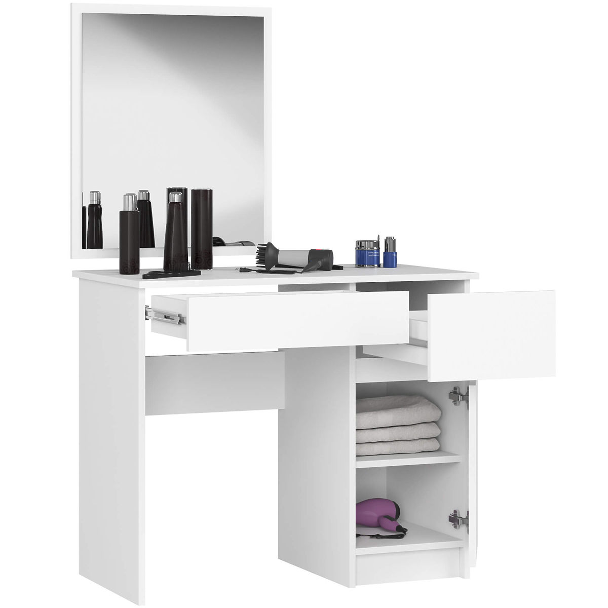 Toaletný stolík so zrkadlom v bielom odtieni so zásuvkami a priestranným miestom za dvierkami. 240