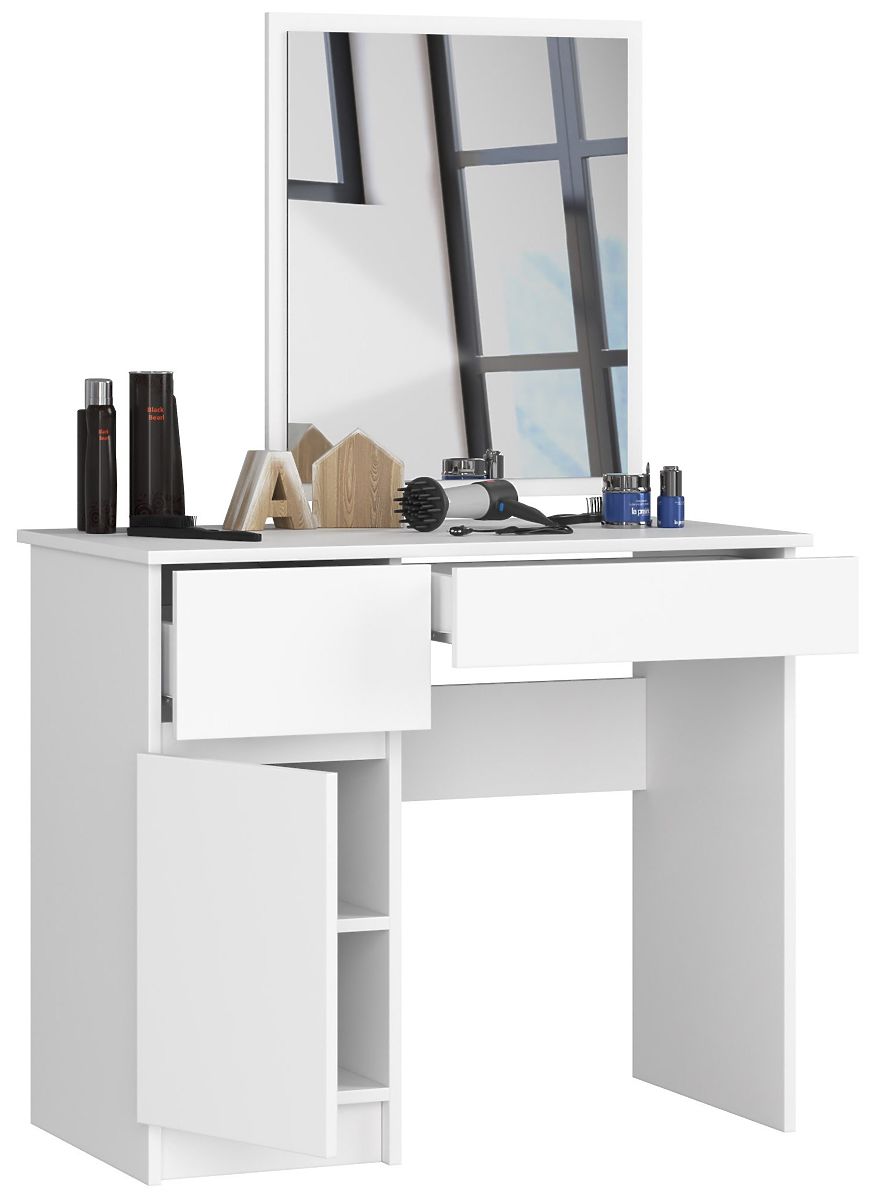 Toaletný stolík so zrkadlom v bielom odtieni so zásuvkami a priestranným miestom za dvierkami. Ľavostranná konfigurácia.