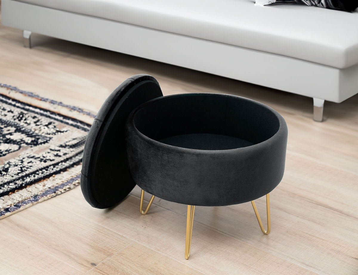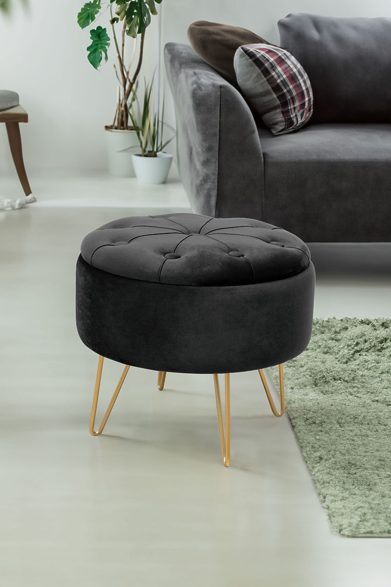 Podnožka alebo pufa je skvelým doplnkom do obývacej izby alebo spálne. Vďaka nej si unavené nohy po celodennom chodení môžu oddýchnuť, a ak je pufa vyrobená z mäkkého velúru, len to umocňuje príjemné pocity z odpočinku. Moderný vzhľad dopĺňajú kovové nohy natreté na zlatú farbu, ktorá je tento rok taká módna. Otváracie veko poskytuje prístup k úložnému priestoru, kam možno uložiť predmety, ktoré nie sú denne potrebné.Špecifikácie: