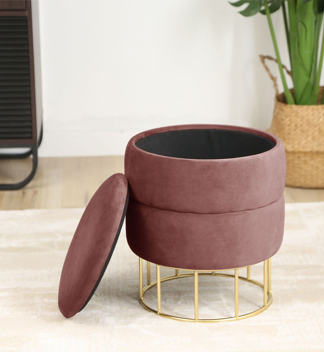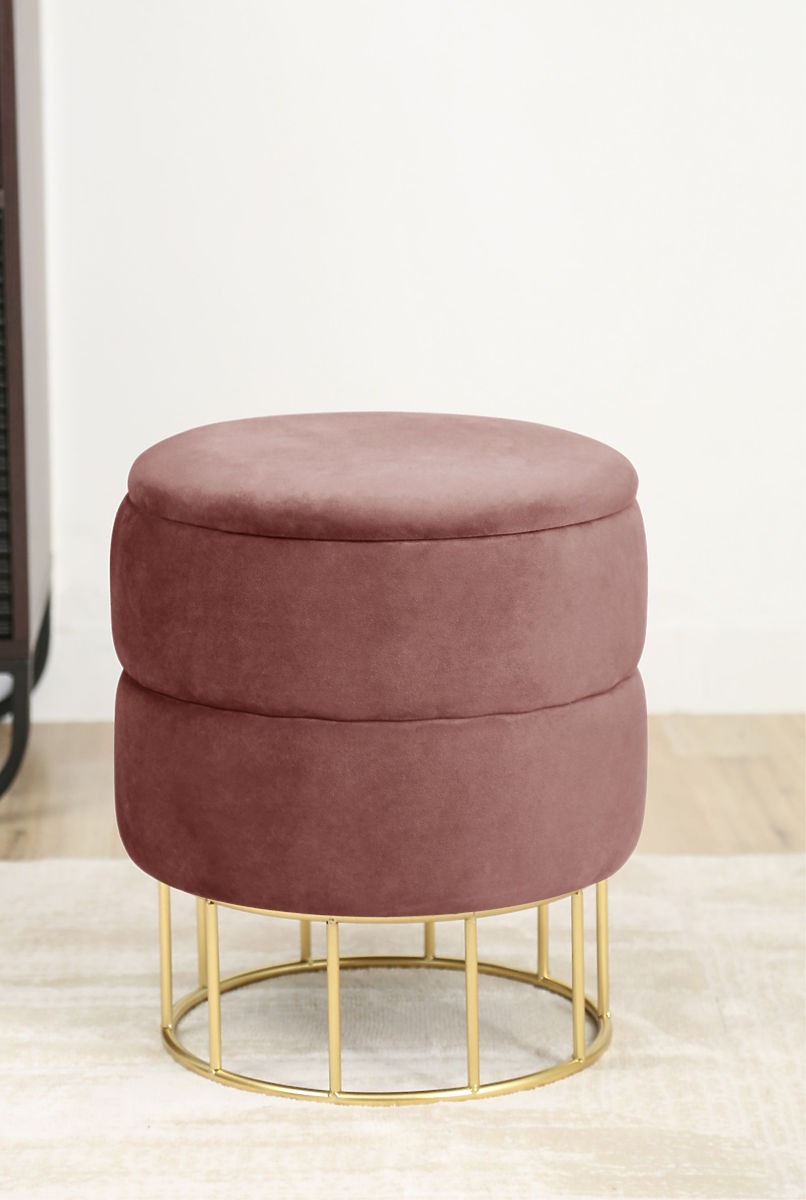 Puf s úložným priestorom na kovovej základni zlatej farby.