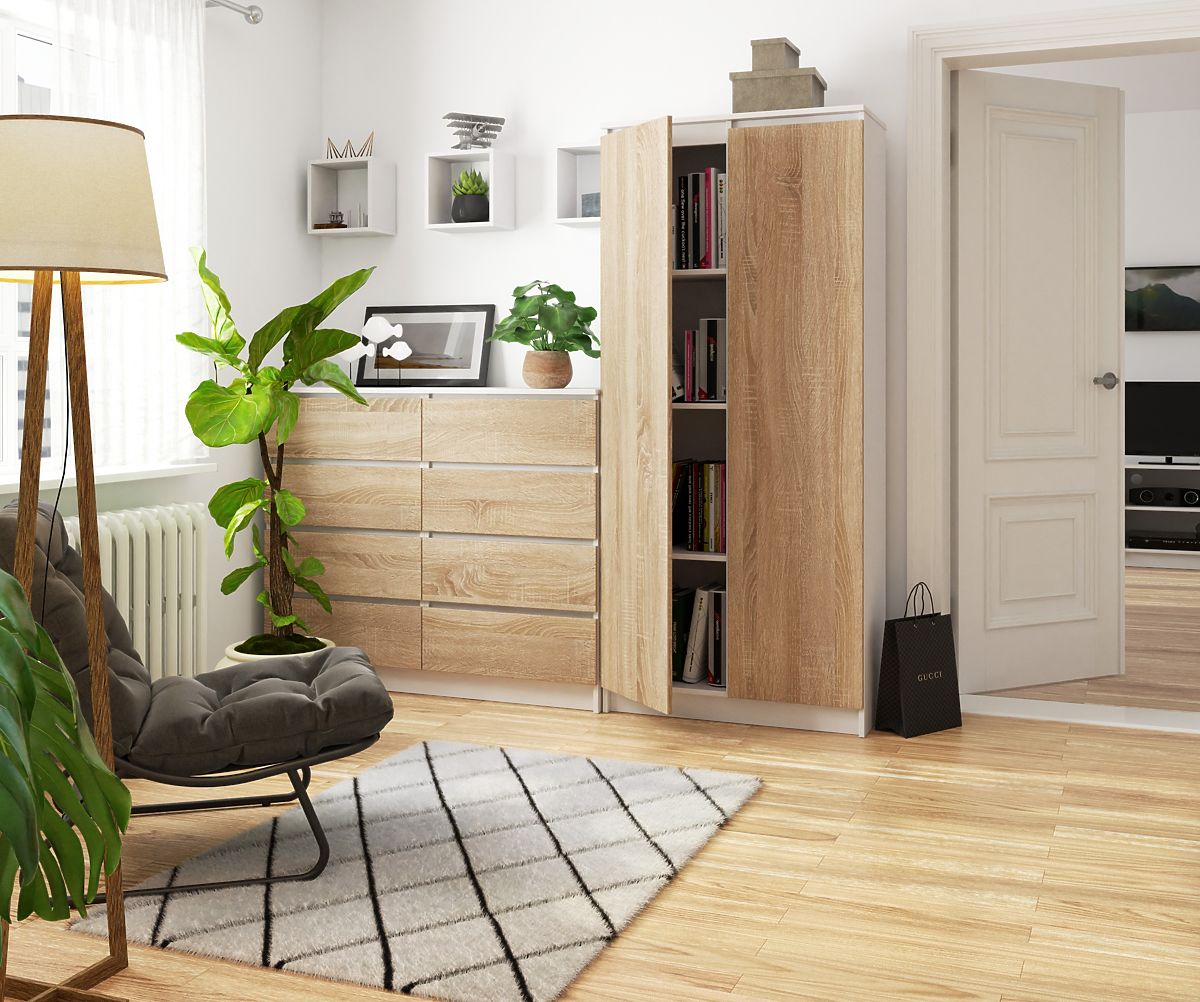 Kancelárska skriňa R 80 cm Clip 2 je nábytok vo farbe biela/sonoma, čo je jedna z najobľúbenejších farieb tejto sezóny. Táto knižnica prinesie do vašej kancelárie poriadok a harmóniu. Je vybavená ôsmimi priestrannými policami, v ktorých uložíte všetky potrebné veci v kancelárii. Navyše sú jej hrany olepené ABS hranou, ktorá poskytuje vysokú ochranu proti poškodeniu. Medzi výhody tejto knižnice patria: