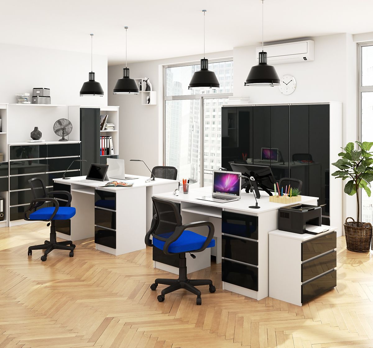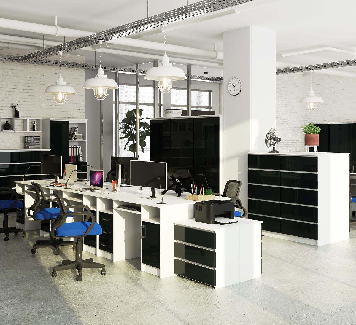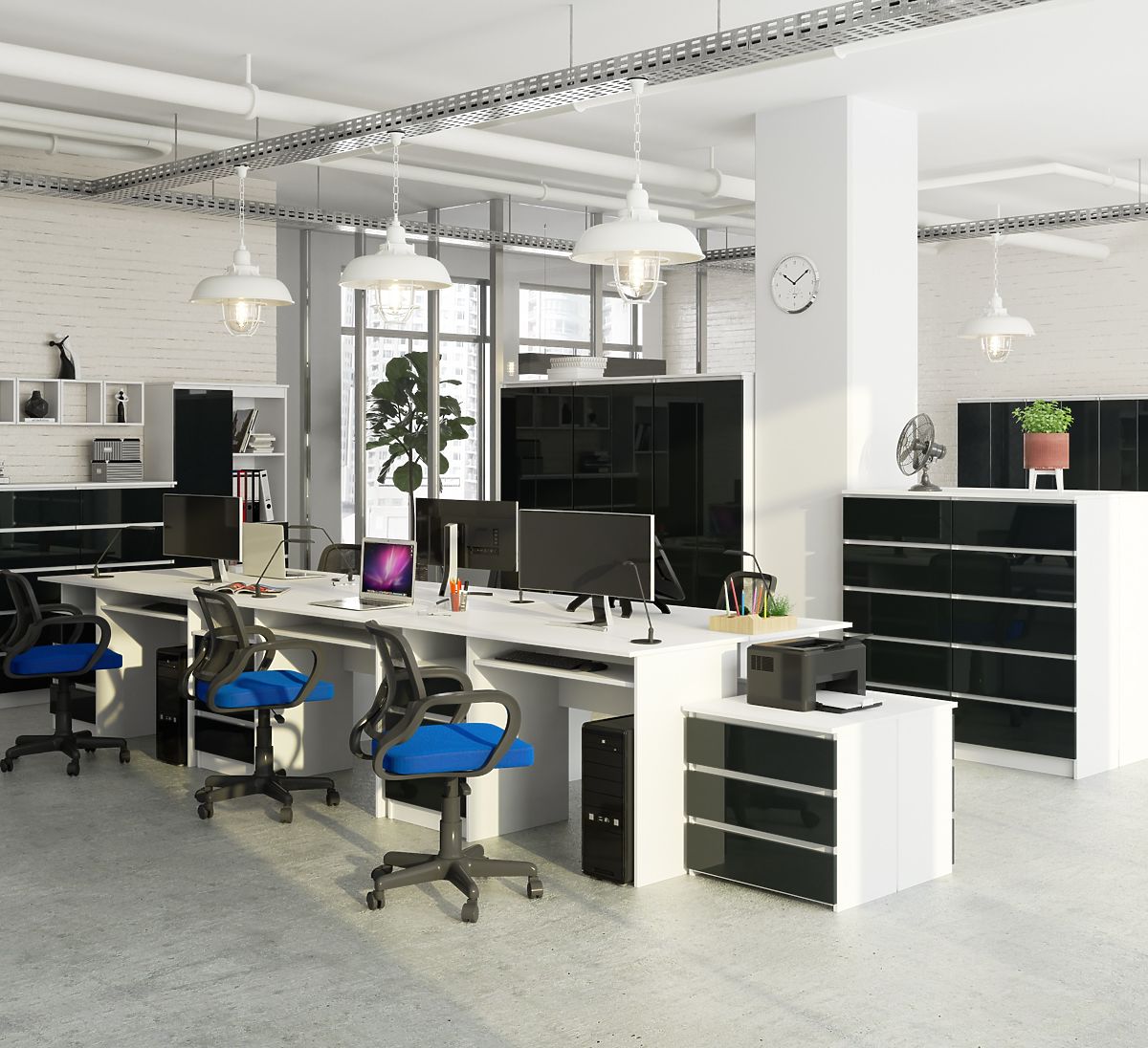 Biely kancelársky regál s grafitovými čelnými stranami vo vysokom lesku je novou ponukou, ktorá je súčasťou Systému Nábytku CLP. Nábytok je vyrobený z dosky pokrytej laminátom od firmy Kronospan, vykazujúci odolnosť proti oderu, zatiaľ čo čelná strana je z akrylovej MDF dosky najvyššieho štandardu lesku. Vysoká kvalita spracovania je viditeľná v každom detaile – hrany sú zakončené ABS hranou, aby bola zabezpečená trvanlivosť a odolnosť proti poškodeniu. Podľa preferencií je možné dvierka namontovať na pravú alebo ľavú stranu. Regál má celkovo 8 políc, z ktorých polovica je zakrytá, čo umožňuje diskrétne uloženie osobných predmetov. Otvorené police sú ideálne na umiestnenie kníh alebo vystavenie farebných doplnkov. Minimalistický štýl regálu sa dobre hodí ako do moderného kancelárskeho interiéru, tak do domácnosti zariadenej v škandinávskom štýle. Biela dodáva ľahkosť a eleganciu, zatiaľ čo lesklý grafit pridáva charakter. Je to ponuka pre tých, ktorí si cenia jednoduché a moderné formy.
