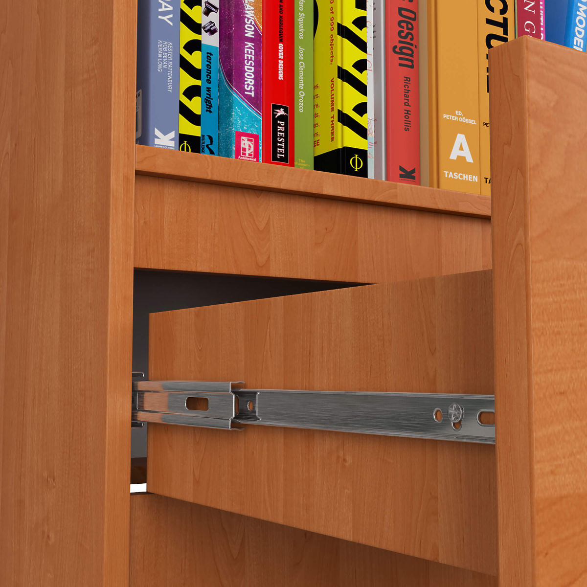 - Zásuvka sa pohybuje na kovových guľôčkových pojazdoch s blokáciou výsuvu