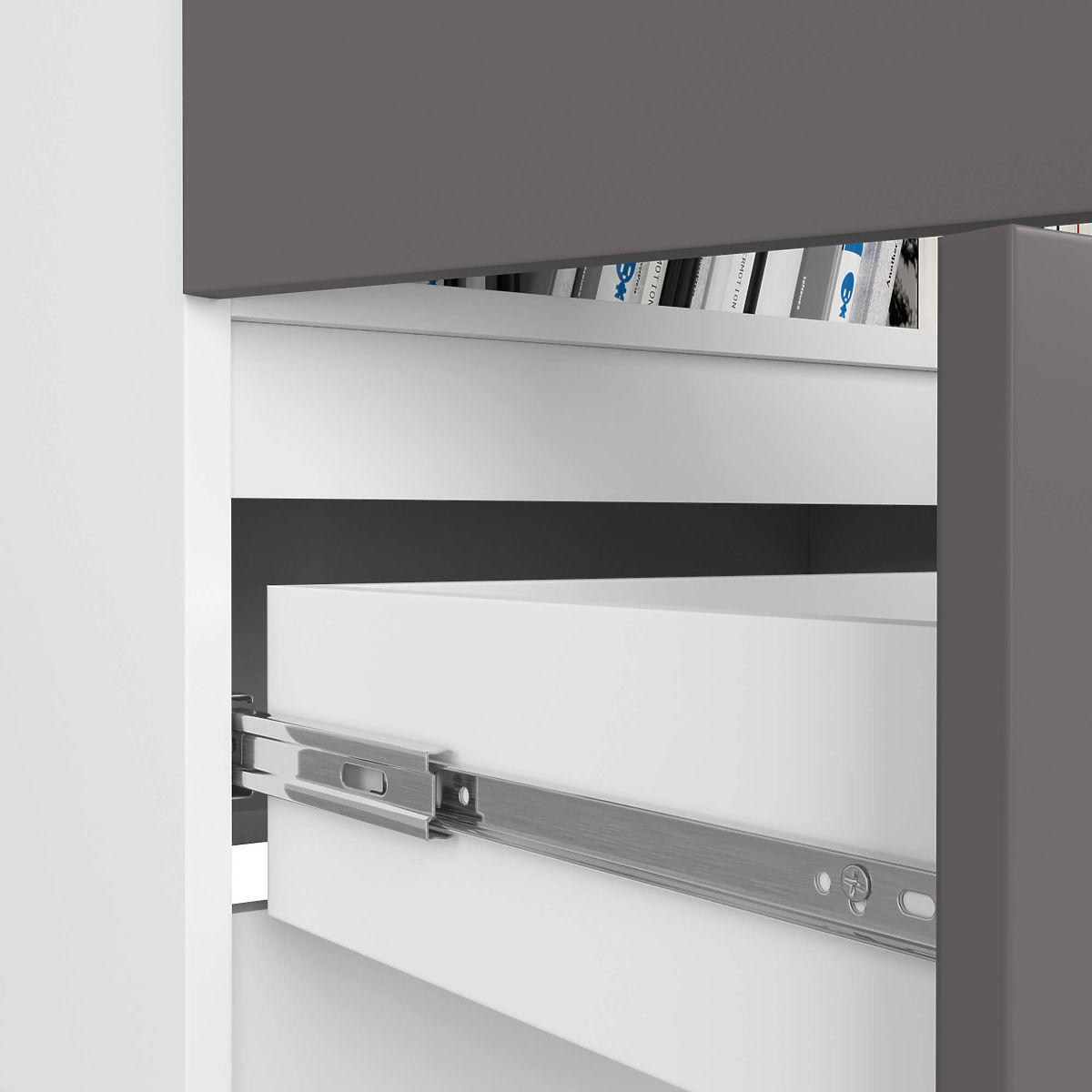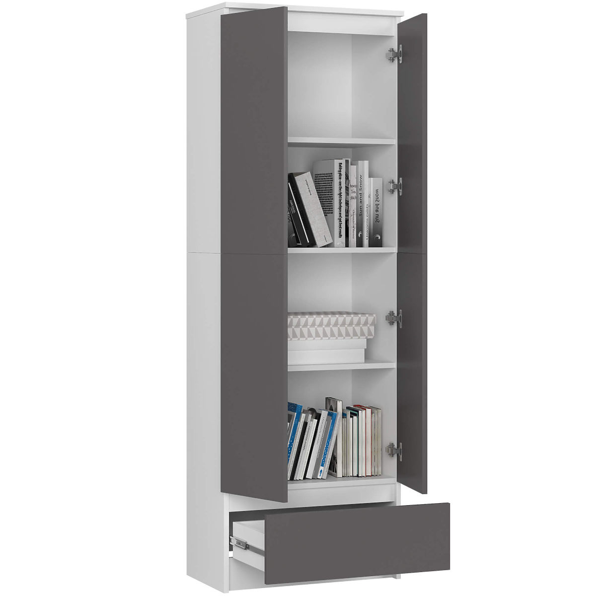 Kancelársky regál CLP 1 je vybavený priestrannou skrinkou s výškou 180 cm a šírkou 60 cm. Nábytok má výklopné dvere, za ktorými sa nachádzajú 4 priestranné police. Tie možno ľubovoľne konfigurovať, pretože majú 3 montážne otvory. Ďalším vylepšením je priestranná zásuvka, ktorá sa pohybuje na moderných, praktických guľôčkových pojazdoch. Zásuvka má blokáciu výsuvu. Čelá nábytku sú vyrobené v elegantnej grafitovo sivej farbe, zatiaľ čo korpus je biely.