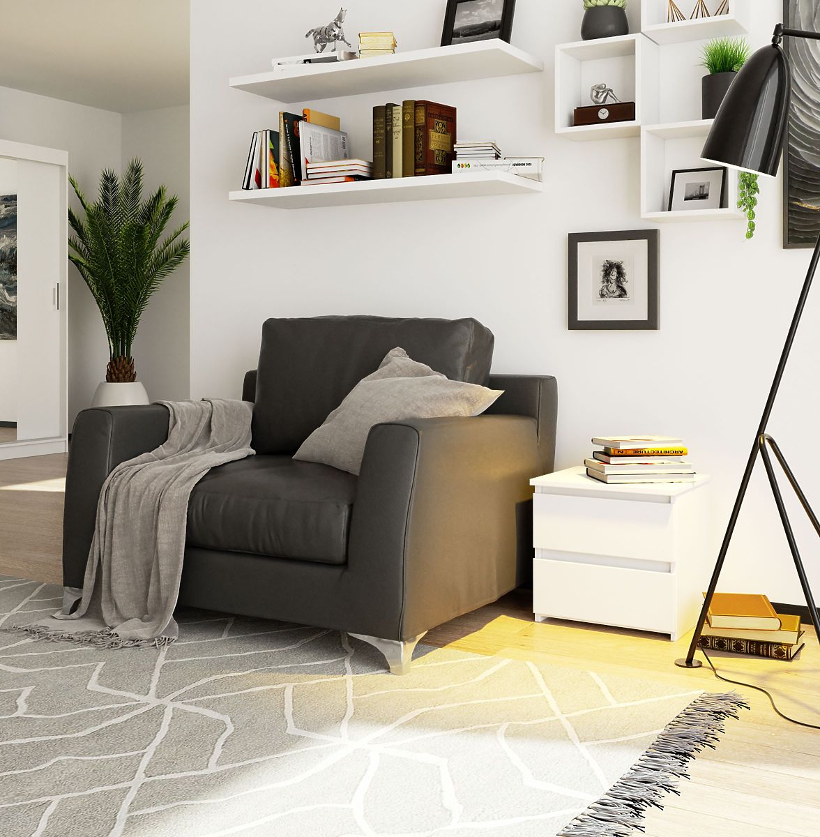 Nočný stolík je jedným zo základných kusov nábytku v spálni. Nočný stolík je bielej farby, vyrobený z laminovanej dosky s hrúbkou 16 mm, ktorá je navyše odolná proti oderu. Čelá a boky nočného stolíka sú olepené ABS hranou, ktorá poskytuje väčšiu odolnosť proti drobným mechanickým poškodeniam, ako sú oderky. Má dve priestranné zásuvky bez úchytiek, do ktorých sa zmestia všetky potrebné predmety, ktoré by mali byť po ruke. Stolík má rozmery 40 cm na dĺžku, 40 cm na výšku a 35 cm na hĺbku. Zásuvky sú vybavené kovovými valčekovými pojazdmi, ktoré je možné ľahko vybrať a vyčistiť v prípade potreby. Vďaka univerzálnemu vzoru a farbe sa hodí do každej spálne a je možné ho úspešne kombinovať s ďalšími kusmi nábytku zo systému CLP. Moderný a zároveň minimalistický vzhľad umožňuje jednoduché začlenenie do mnohých interiérových štýlov. Doska je dostatočne veľká, aby pojala ako nočnú lampu, tak drobné dekorácie alebo knihu.