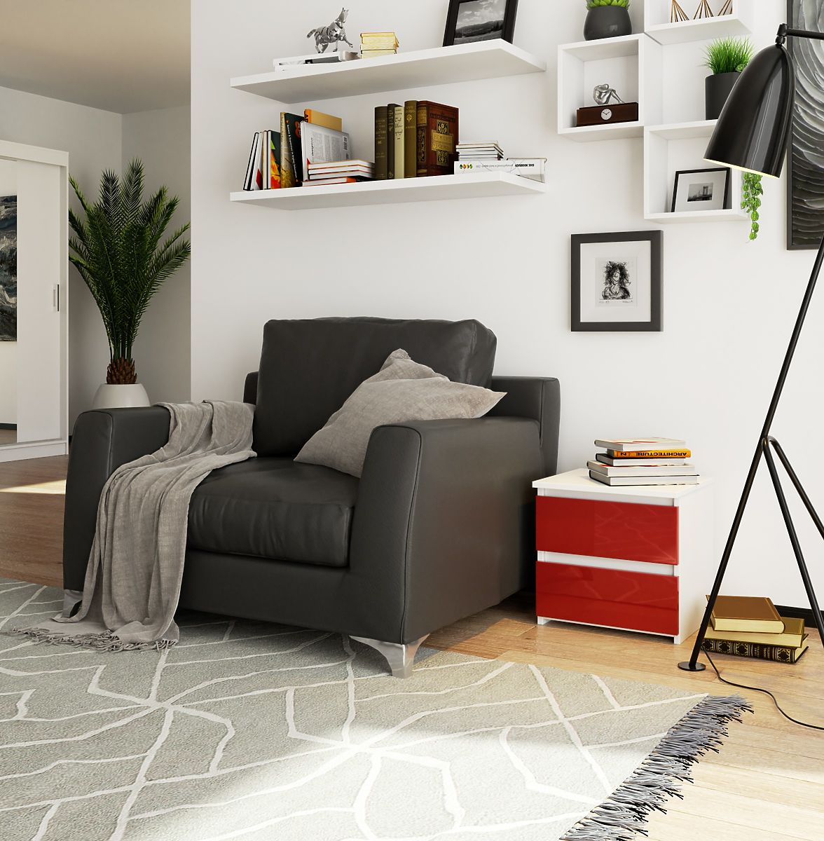 V ponuke nášho obchodu nájdete módny a kvalitný nočný stolík, ktorého dizajn a kvalita vás ohromia. Skrinka je vyrobená z laminovanej dosky, ktorá je odolná proti oderu. Vďaka tomu máte záruku, že tento krásny nábytok vám bude slúžiť po roky, bez straty estetických hodnôt. Stojí za to dodať, že aj čelá boli vyrobené z dosky červený lesk. Okrem toho sa zásuvky v tejto skrinke pohybujú na kovových kolieskových vodičkách. Aby bola zabezpečená ešte väčšia ochrana, sú hrany a čelá skrinky olepené ABS hranou, ktorá má za cieľ zabezpečiť nábytku vysokú ochranu pred všetkými mechanickými poškodeniami.