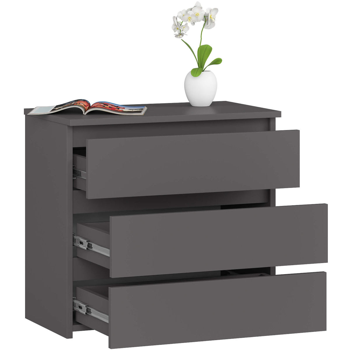 Komoda grafitová šedá má 3 pohodlne otvárateľné zásuvky. Skvele sa hodí do spálne ako nevyhnutný prvok jej vybavenia. V zásuvkách je možné uložiť prádlo, kozmetické doplnky alebo sadu posteľnej bielizne na výmenu. Doska je ideálna na umiestnenie nočnej lampičky a položenie zaujímavej čítania. Nábytok je možné umiestniť aj do detskej izby a spálne tínedžera.