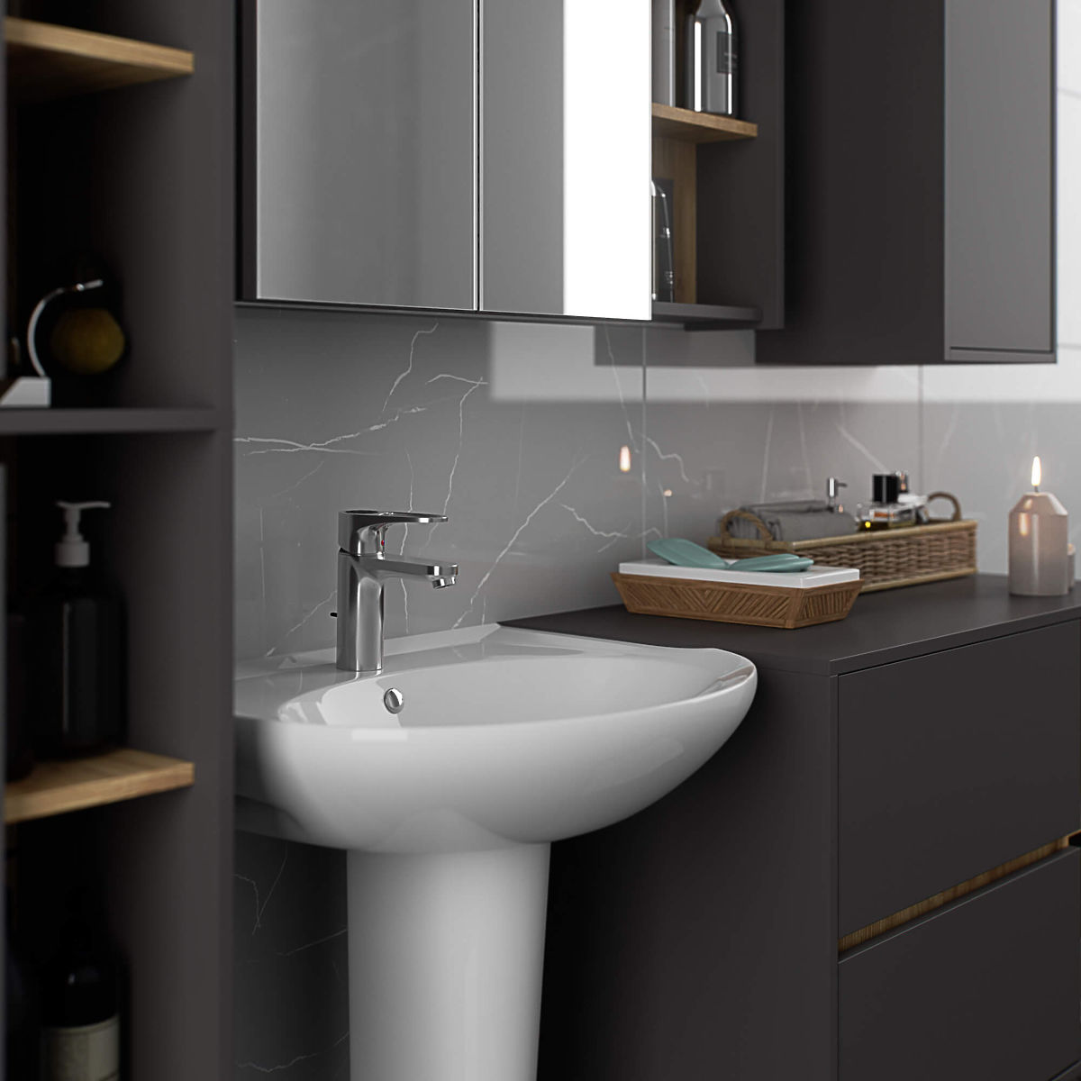 Kúpeľňové skrinky skvele dopĺňajú vybavenie kúpeľne, poskytujú potrebné miesto na všetky kozmetické výrobky a detergenty a dodávajú kúpeľni určitý štýl. Priestranné skrinky uľahčujú udržanie poriadku v miestnosti, čo pozitívne ovplyvňuje estetiku interiéru. Kolekcia VAMI sa vyznačuje pútavou štýlovou farebnosťou – korpus a čelá majú rovnakú farbu, zatiaľ čo vnútorná farba je iná.