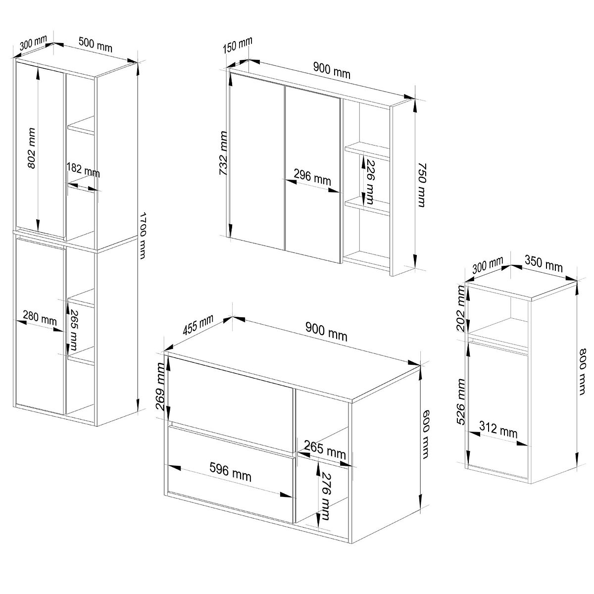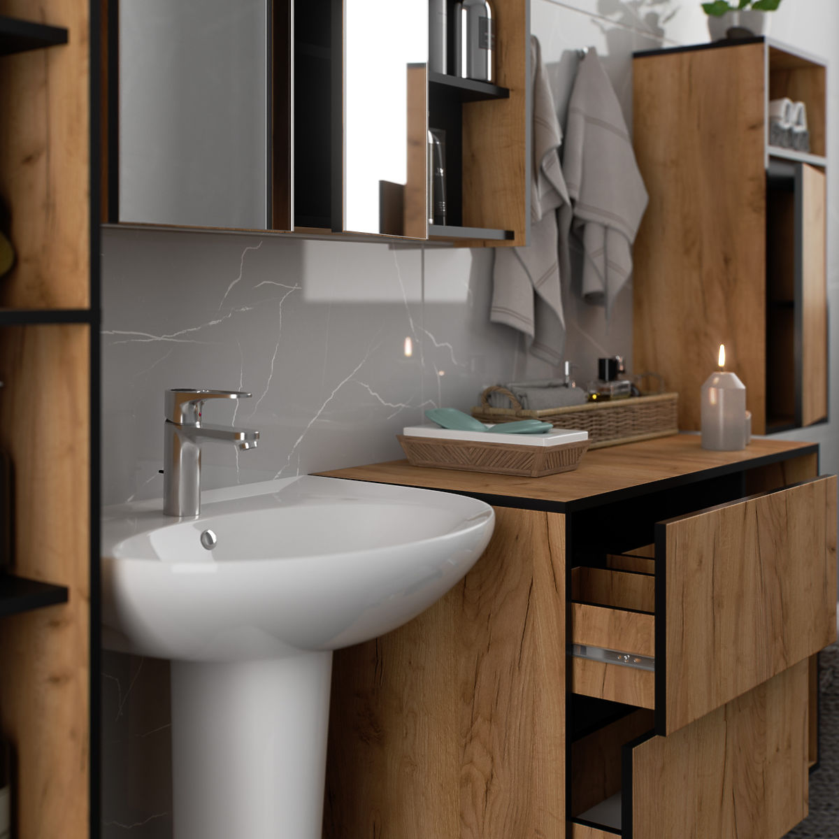 Sada kúpeľňového nábytku VAMI je kvintesenciou moderného štýlu. Vďaka otvoreným policiam sú skrinky vizuálne ľahké a dokonale zapadajú do najnovších dizajnových trendov. Kúpeľňový nábytok VAMI ponúka tiež značný uzavretý priestor na uloženie čistiacich prostriedkov, kúpeľňových potrieb a kozmetiky. Sada obsahuje závesnú skrinku pod umývadlo s doskou, 2 zásuvkami a 2 otvorenými policami (W90), závesnú skrinku s 1 otvorenou policou W35, vysokú závesnú skrinku W50 so 6 otvorenými policami a závesnú skrinku so zrkadlom a 3 otvorenými policami W90. Celkovo je farebne a štýlovo konzistentná, čo dáva sade harmonický vzhľad. Skrinka pod umývadlo má tvarované zásuvky umožňujúce montáž sifónu a hydraulických prvkov. Sada obsahuje: