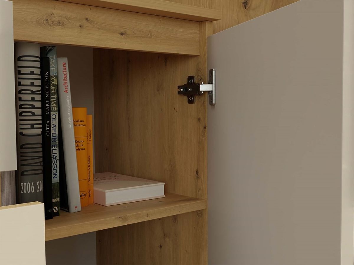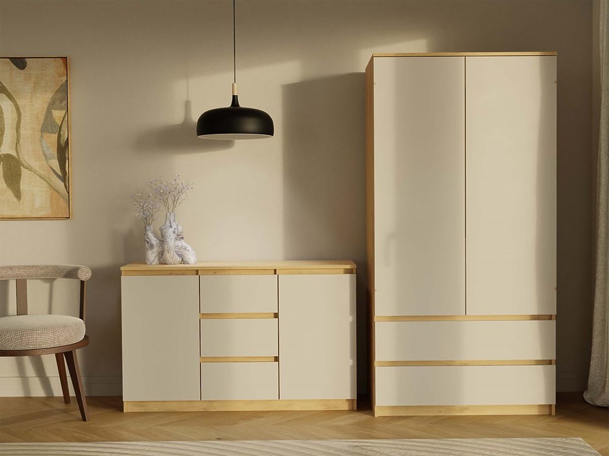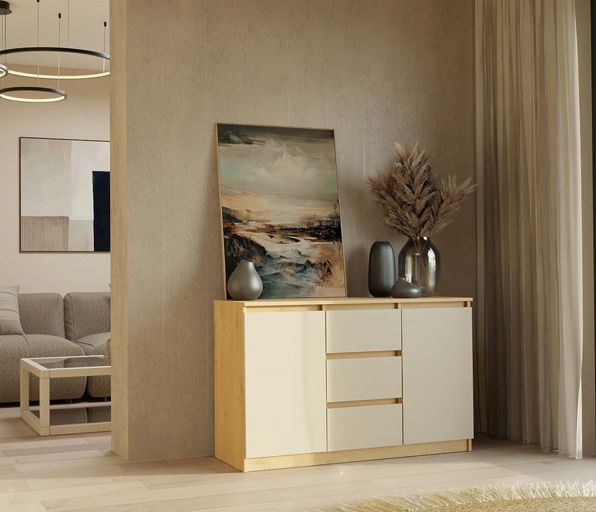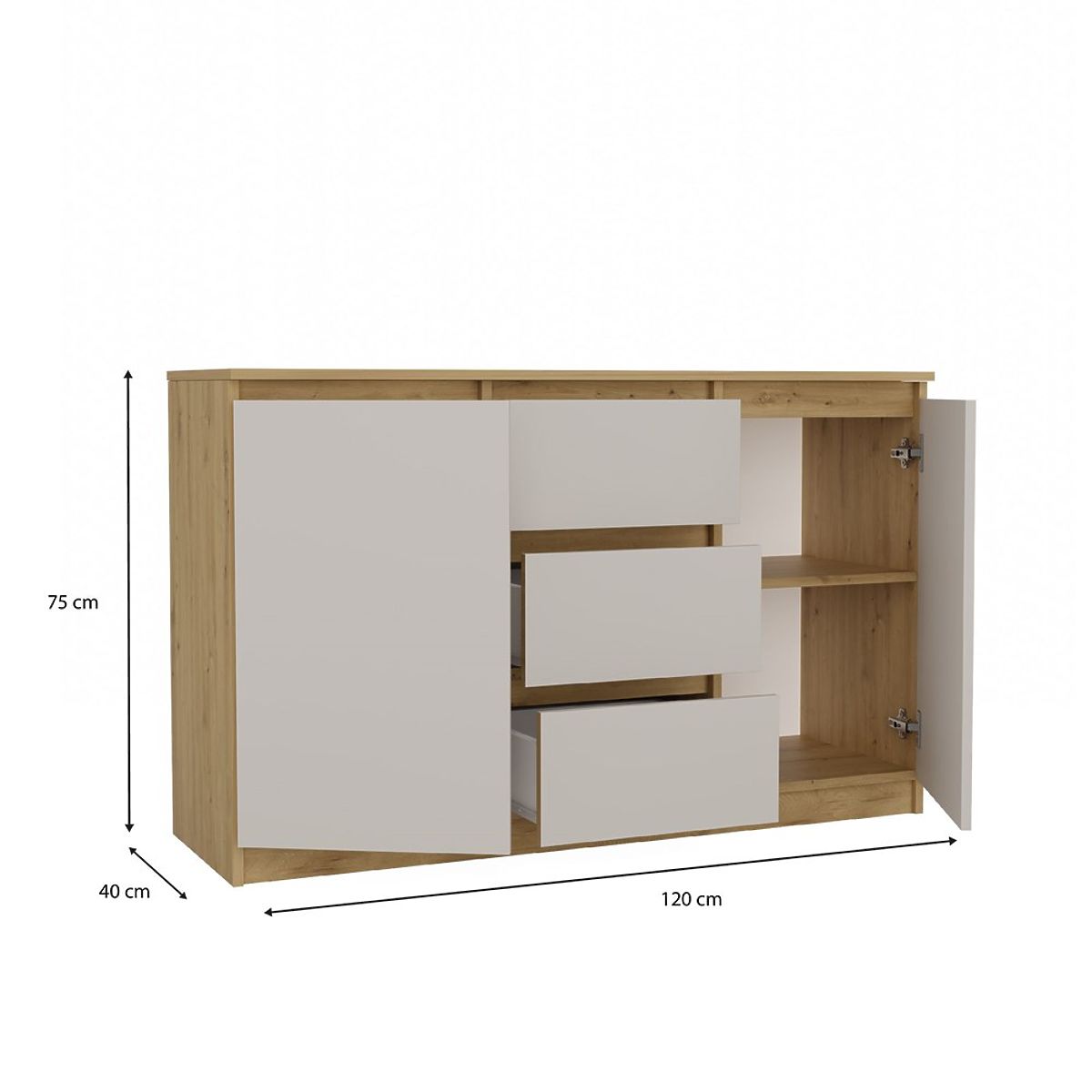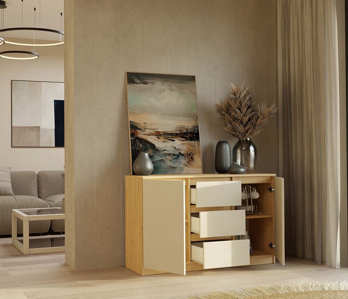 Komoda s dvoma dverami a tromi zásuvkami v modernom béžovom odtieni. .. viac