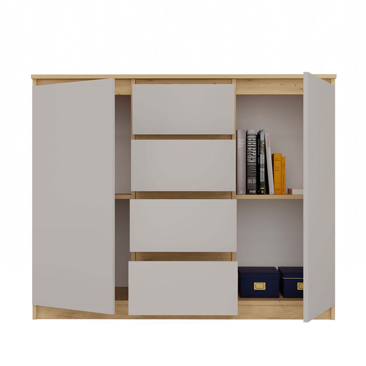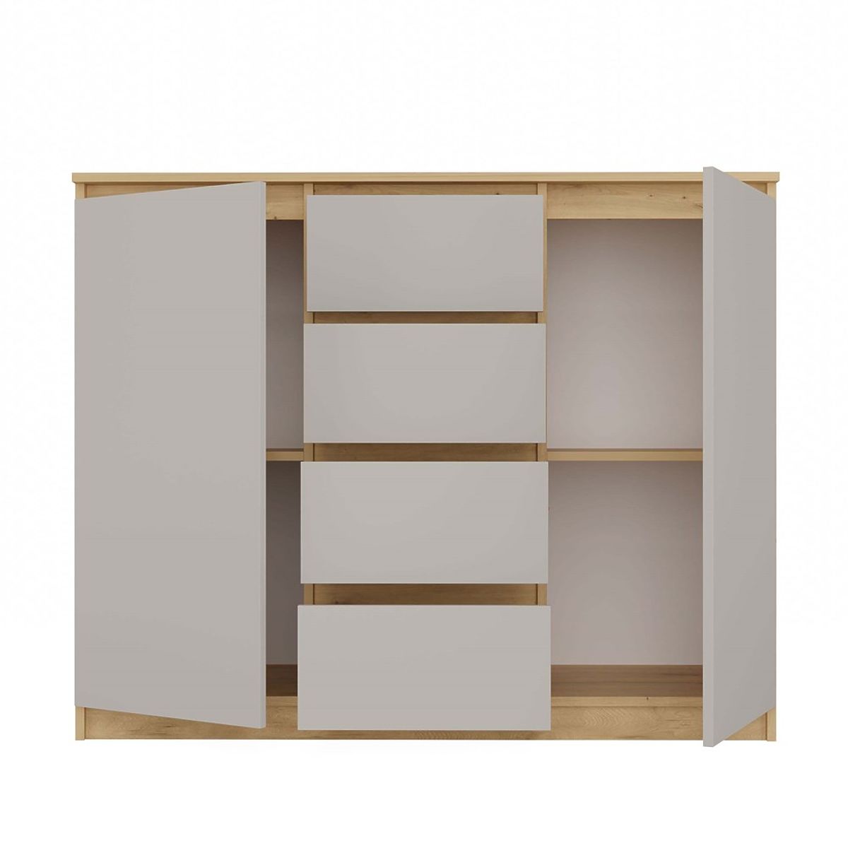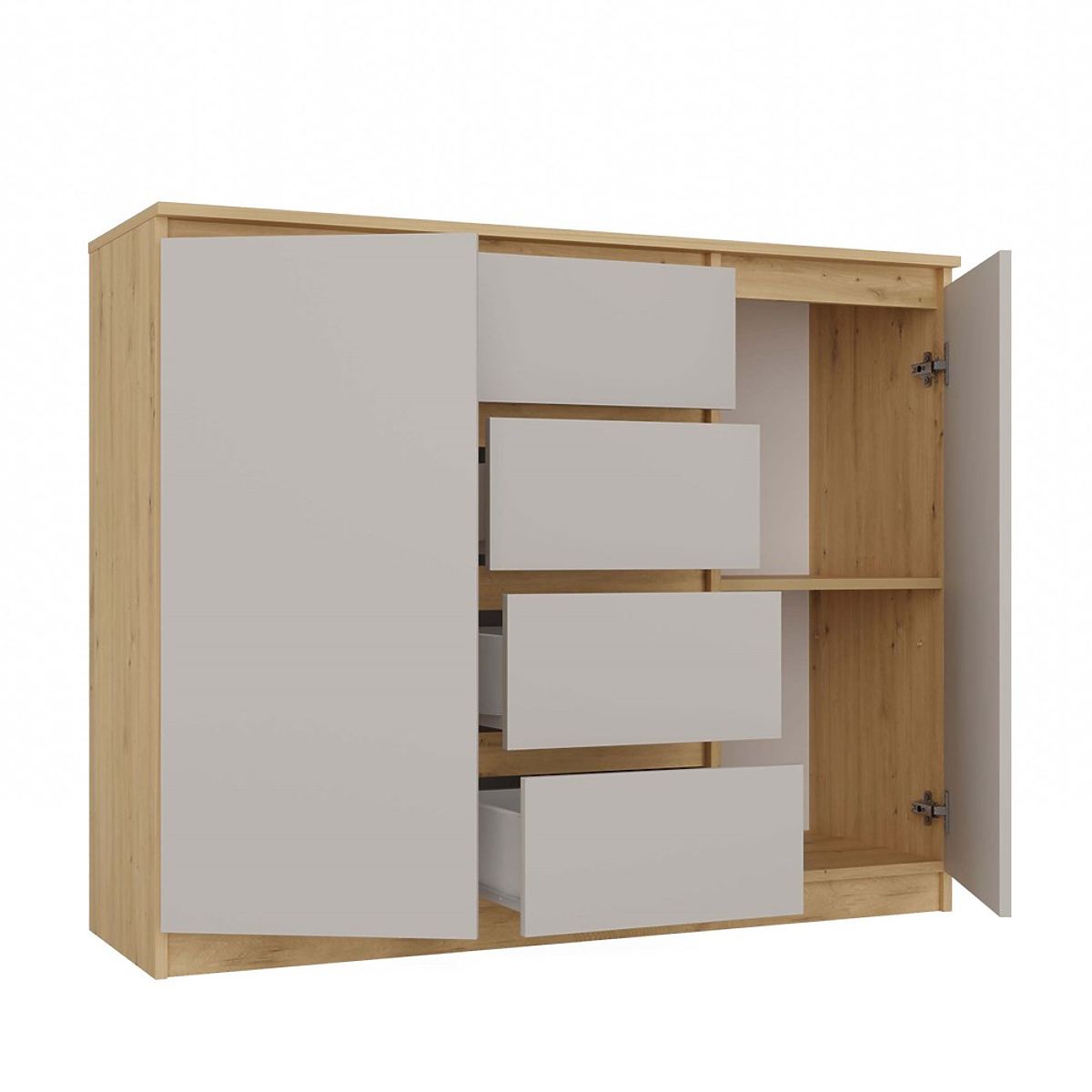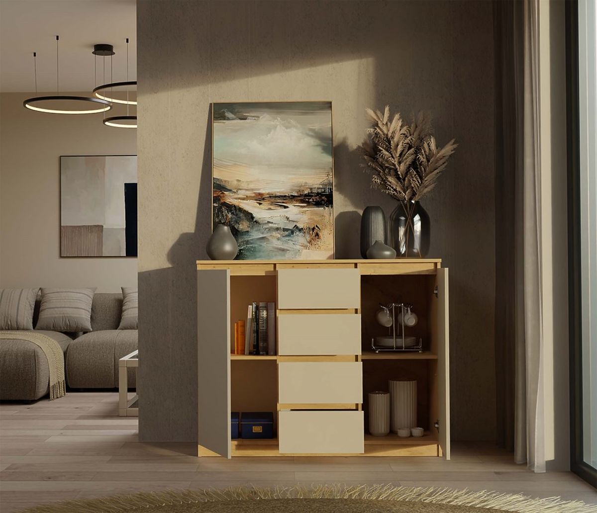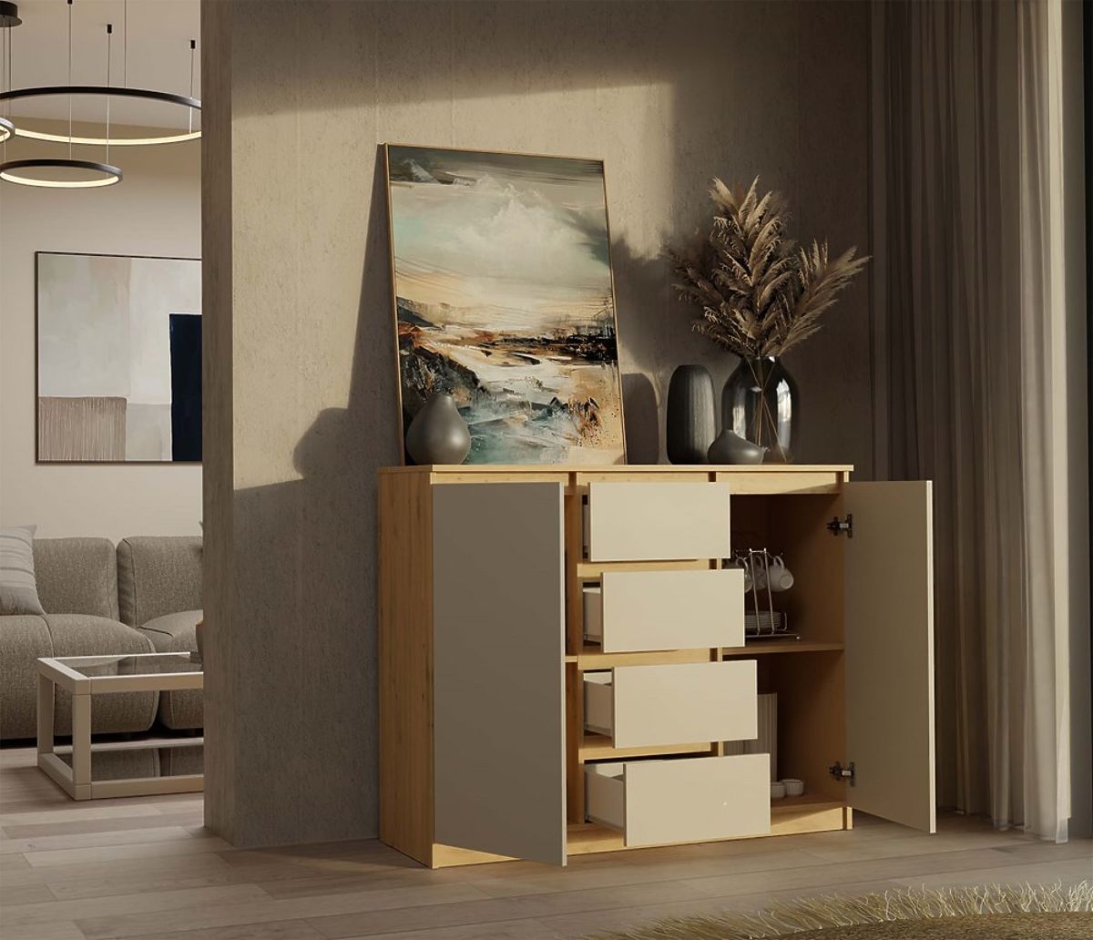 Komoda 2D4S je štýlový a priestranný nábytok, ktorý sa skvele hodí do spálne, obývacej izby, detskej izby alebo predsiene. Jej univerzálny vzhľad je kombináciou jednoduchosti a elegancie, ideálny pre moderné a minimalistické interiéry.