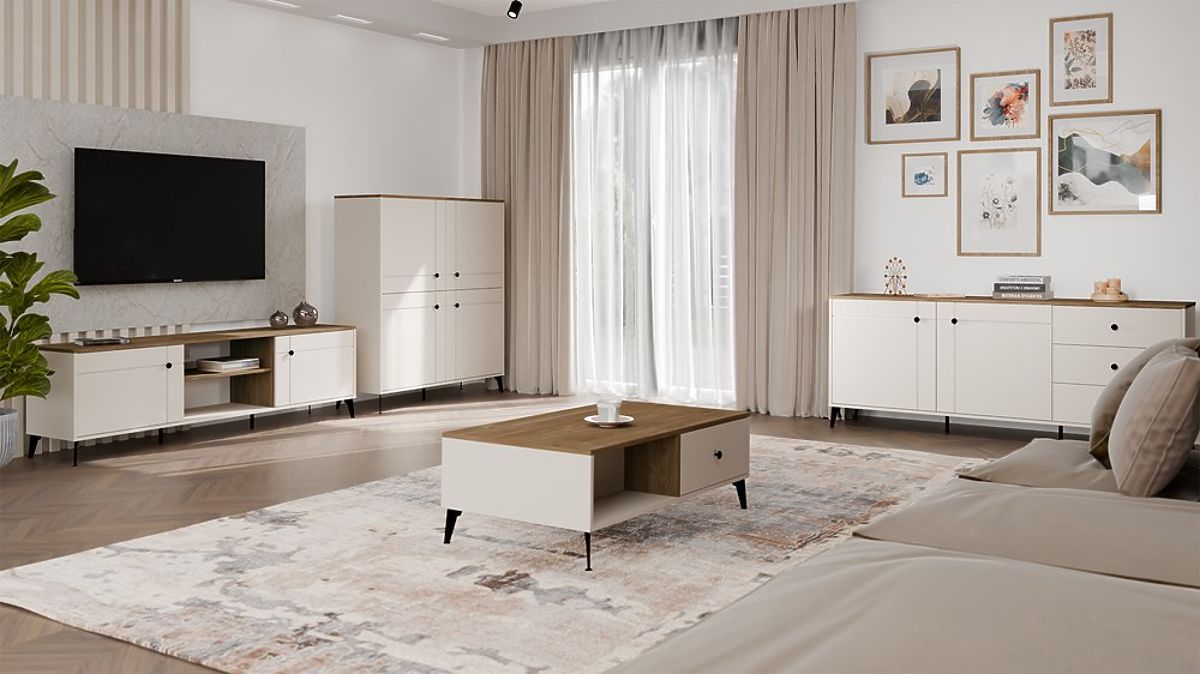 Čierny detail v podobe úchytiek a vysokých, kovových nožičiek dodáva nábytku ľahkosť a charakter. Na oboch stranách stolíka sa nachádzajú praktické zásuvky s tichým dovieraním – ideálne pre drobné predmety každodennej potreby. Centrálne otvorené police poslúžia ako miesto pre časopisy, ovládače alebo knihy.