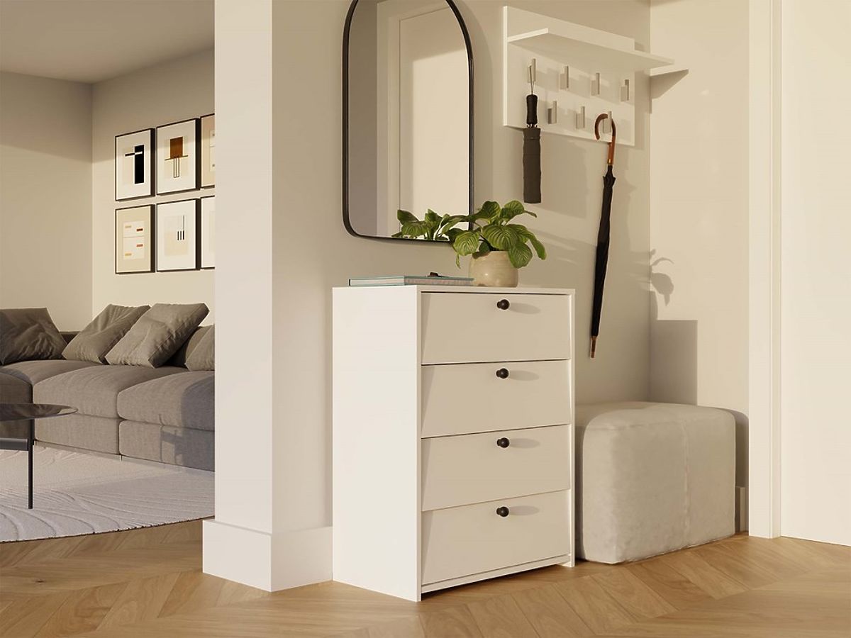 Minimalistická forma a univerzálna biela farba zabezpečujú, že botník ľahko zapadne do rôznych aranžmánov - od klasických po moderné. Môže slúžiť ako samostatný prvok alebo byť súčasťou väčšej nábytkovej zostavy do predsiene.