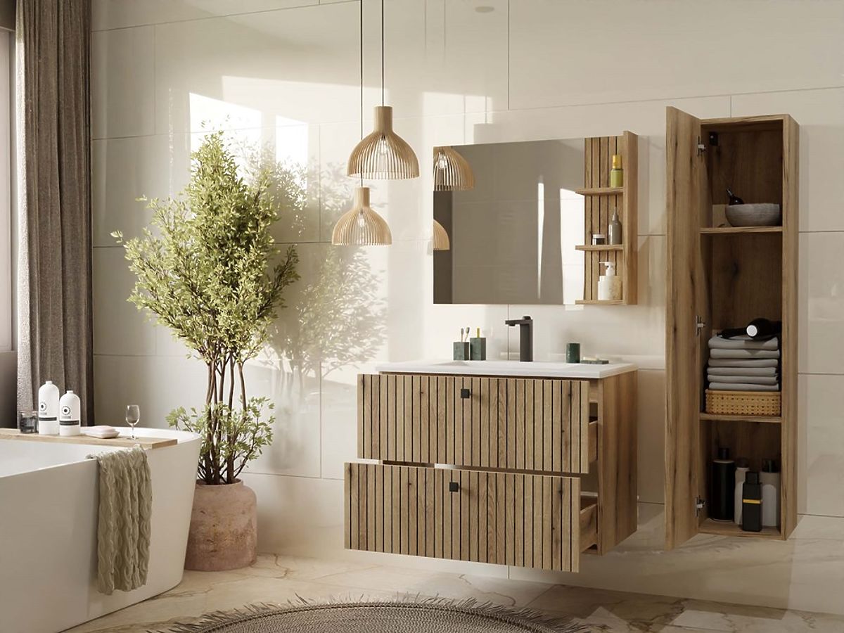 Lukafurniture.sk » Kúpeľňa a WC / Kúpeľňové skrinky / ZÁVESNÁ SKRINKA POD UMÝVADLO TIGO 80 2S DUB EVOKE 2 ZÁSUVKY DRÁŽKOVANÝ ČELNÝ PANEL