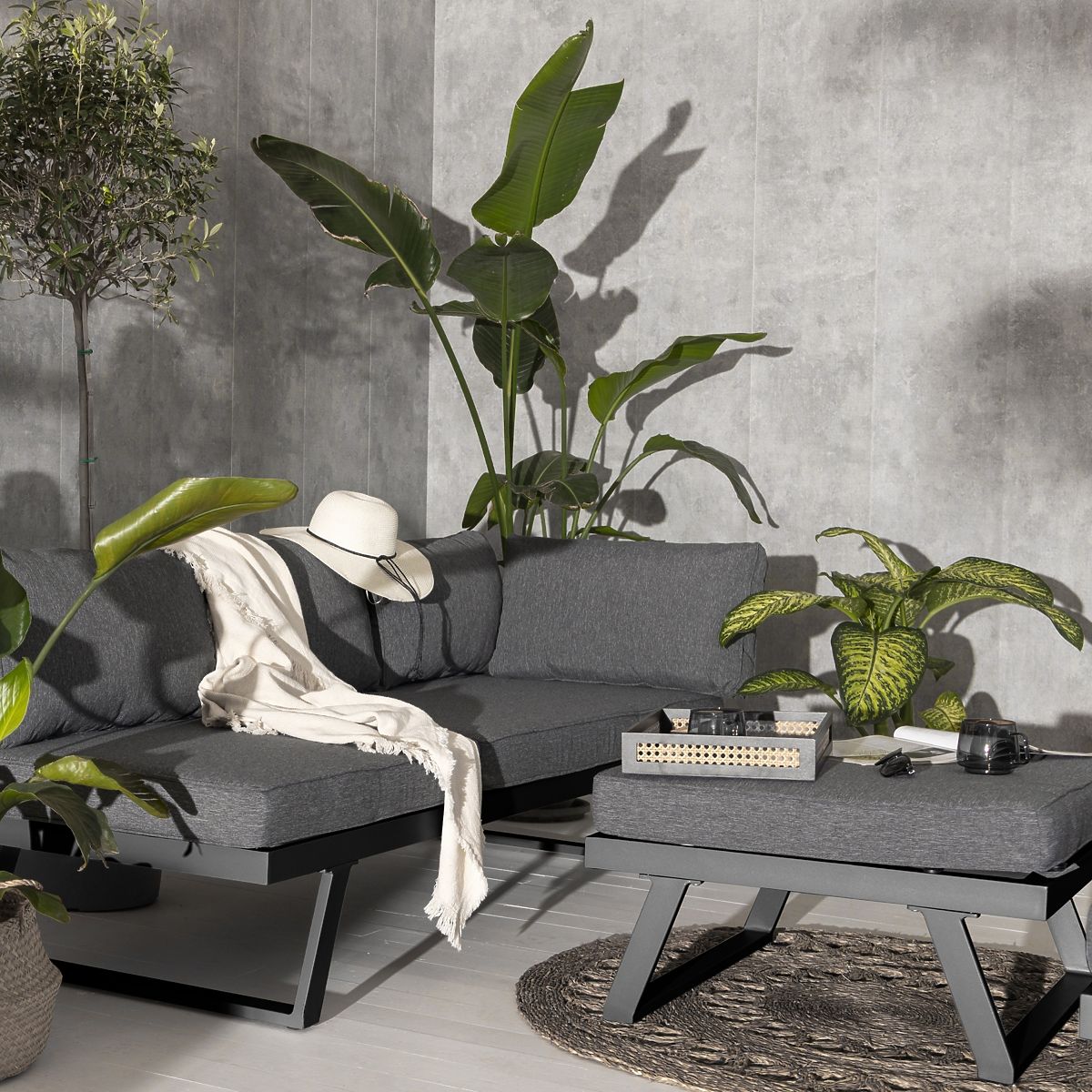 Lukahome.sk » Záhradný nábytok / Záhradné pohovky / Záhradná rohová sedačka so stolíkom Lafoole Lunge, spun-poly, tmavo sivá