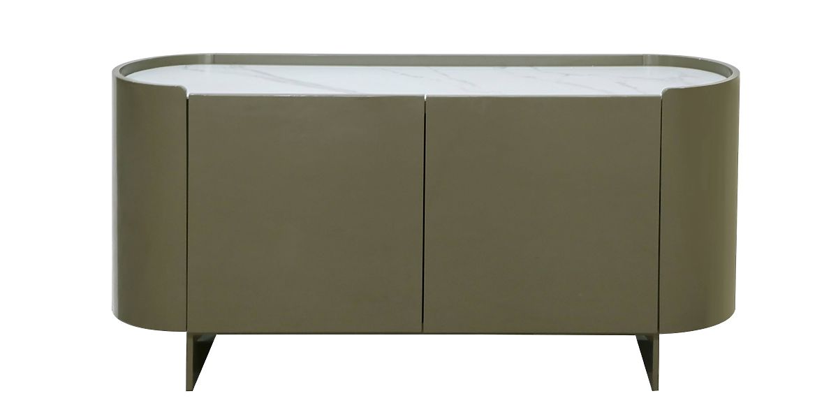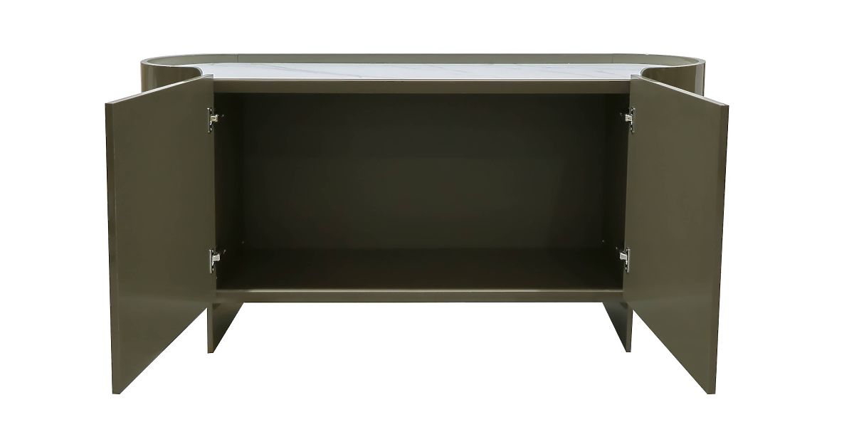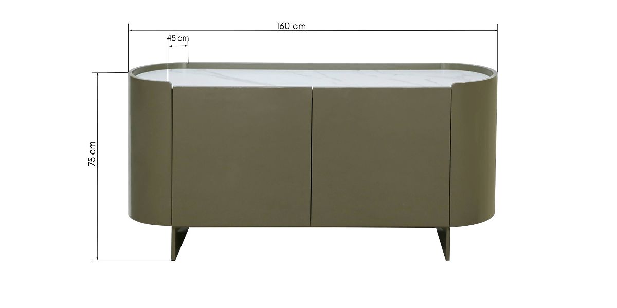 Už na prvý pohľad očarí - komoda Nari je dokonalým spojením moderného dizajnu a nadčasovej krásy. Jej zaoblené hrany a oválny tvar dodávajú ľahkosť a výnimočný pôvab. Doska zo spieku imitujúceho mramor dokonale ladí so zeleno-šedým odtieňom korpusu, vytvára výraznú kompozíciu, ktorá priťahuje pohľady. Hladké, bezúchytkové čelné plochy podčiarkujú minimalistický štýl komody a celkový vysoký lesk dodáva eleganciu a moderný charakter. Model Nari nie je len o dizajne, ale aj o funkčnosti – za dvierkami sa skrýva priestor určený na pohodlné ukladanie. Ak milujete krásne interiéry a neuznávate kompromisy medzi štýlom a funkčnosťou, komoda Nari je dokonalou voľbou! Povrchy s vysokým leskom sú náchylnejšie na poškriabanie. Pre ochranu komody odporúčame používať podložky pod umiestnené predmety.