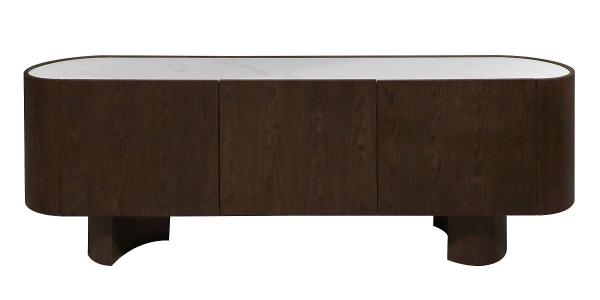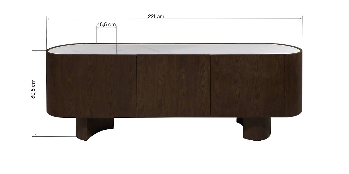 Elegancia a funkčnosť v jednom – takto možno opísať komodu Coria. Jej korpus z MDF dosky, zakončený dyhou z topoľového dreva v odtieni tmavého orecha, vyžaruje prirodzený pôvab dreva, zatiaľ čo kontrastná doska zo spieku imitujúceho mramor podčiarkuje moderný charakter nábytku. Za hladkými čelnými plochami sa skrývajú dve priestranné skrinky, ktoré poskytujú praktické miesto na uloženie a umožňujú udržiavať poriadok v priestore. Jemne zaoblený tvar, prepracované detaily a elegantná kombinácia materiálov robia z komody Coria ideálnu voľbu ako pre moderné, tak aj klasické interiéry.