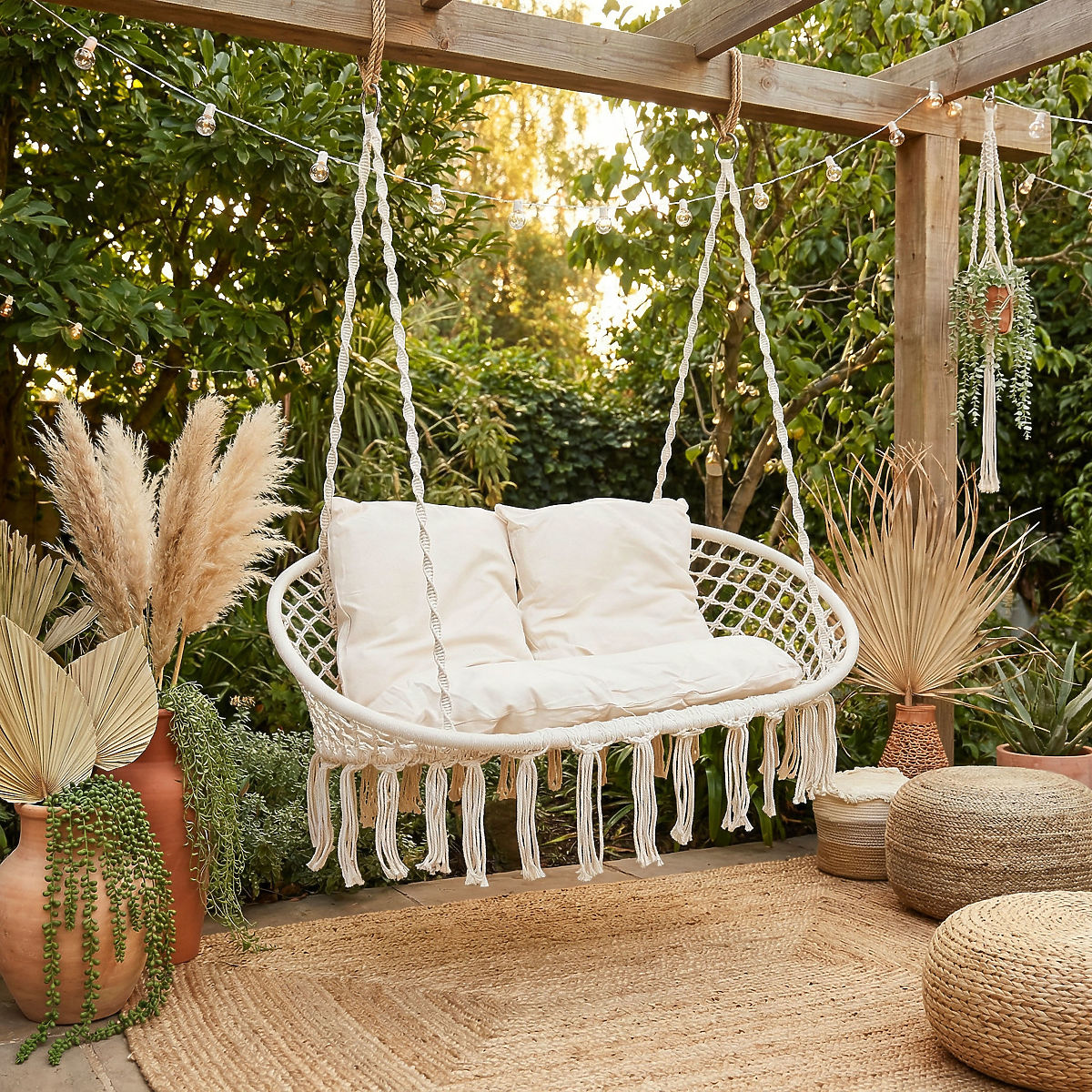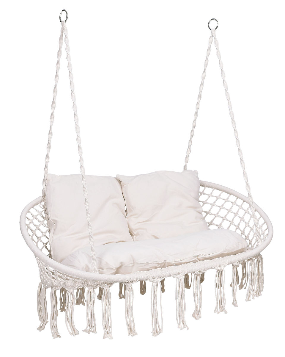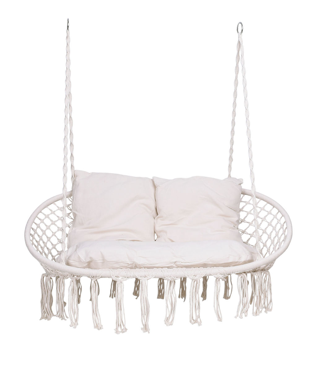 Záhradná hojdačka Lagos je najnovším trendom v interiérovom dizajne. Ideálna pre odpočinok vo dvojici, s nosnosťou až 300 kg. Oceľový rám je pokrytý krásnymi pletenými vzormi v štýle boho. Laná, ktoré držia pohodlné sedadlo, sú zakončené kovovými krúžkami, čo značne uľahčuje jedno- alebo dvojbodovú montáž hojdačky. Mäkké vankúše priložené k sade vytvárajú oku lahodiacu kompozíciu a výrazne zvyšujú komfort používania.