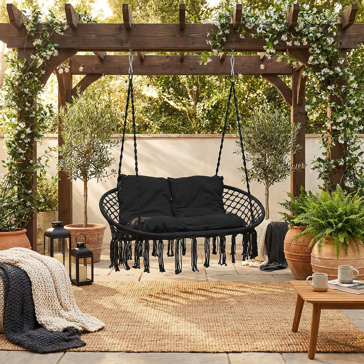 Záhradná hojdačka Lagos je najnovším trendom v interiérovom dizajne. Ideálna na odpočinok vo dvojici, má nosnosť až 300 kg. Oceľový rám je pokrytý krásnymi pletenými vzormi v štýle boho. Laná držiace pohodlné sedadlo sú zakončené kovovými krúžkami, čo výrazne uľahčuje jedno- alebo dvojbodovú montáž hojdačky. Mäkké vankúše priložené k sade tvoria oku lahodiacu kompozíciu a výrazne zvyšujú komfort používania.