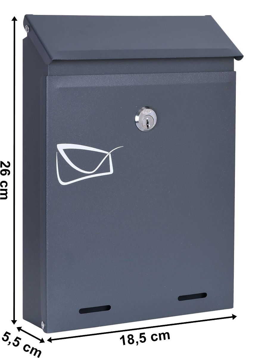 Moderná a funkčná poštová schránka Odvin antracit, navrhnutá s ohľadom na trvanlivosť a eleganciu. Kompaktné rozmery 26 x 18,5 x 5,5 cm a otvor na listy 18 x 2 cm sú ideálne pre menšie priestory. Vyrobená z pozinkovanej ocele s práškovým nástrekom, odolná voči poveternostným vplyvom, vhodná na montáž vonku aj vnútri. Bezpečná vďaka zámku na kľúč – sada obsahuje 2 kľúče a montážne prvky. Solidnosť a štýl v jednom!