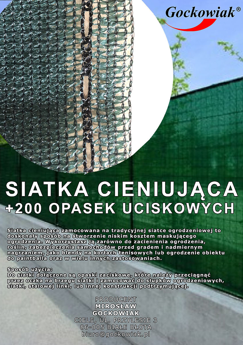 Tieniaca sieť je vynikajúci spôsob, ako vytvoriť maskovacie oplotenie s nízkymi nákladmi. Jej hlavným účelom je obmedziť viditeľnosť a prístup svetla pri súčasnom zachovaní správnej ventilácie. Sieť je husto pletená, vyrobená z najkvalitnejších materiálov HDPE a PP. Obsahuje UV filter, ktorý posilňuje a predlžuje jej životnosť. Redukuje až 90 % slnečného svetla. Verzia so zosilnením vo forme polypropylénových švov blízko montážnych očiek. V balení je 200 kusov sťahovacích pásikov. Sieť je zložená do kompaktných rozmerov pre prepravu.
