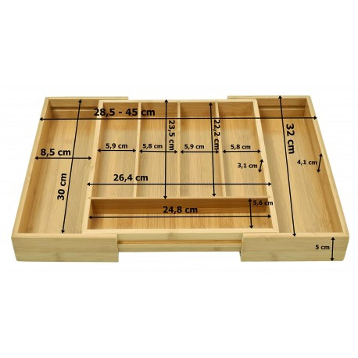 Praktický organizér na príbory vyrobený z prírodného bambusu. Bambusový organizér je veľmi priestranný. Má až 7 praktických priehradiek, päť na príbory a dve ďalšie na nože a väčšie kuchynské náradie. Bambusový organizér je rozkladací, bočné priehradky možno v prípade potreby zasunúť dovnútra a ušetriť tak cenný priestor. Vďaka nemu bude v kuchynských zásuvkách poriadok a čistota. Jeho kompaktné rozmery zaisťujú, že sa zmestí do väčšiny štandardných zásuviek.