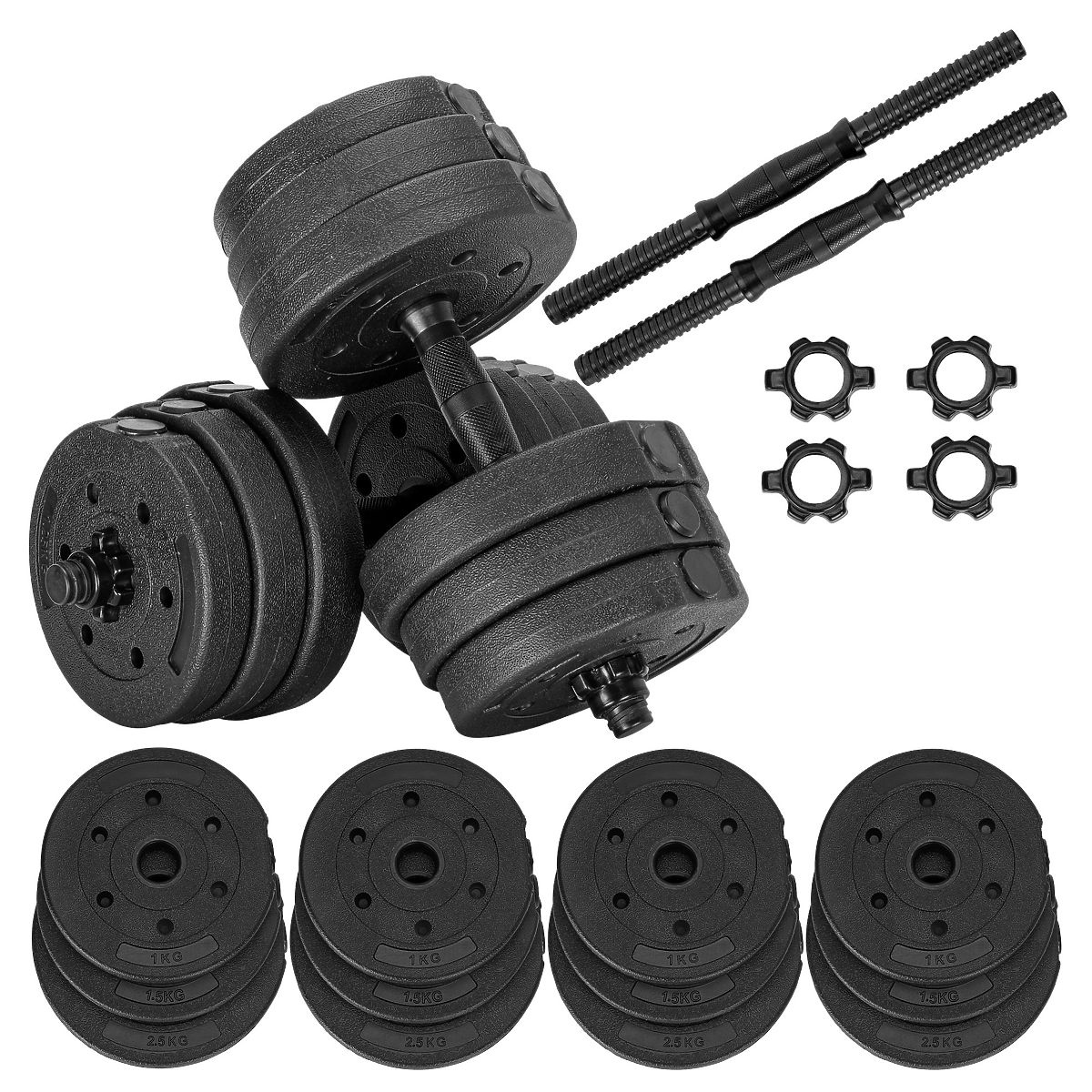 ✅Zloženie sady: 2x úchopy, 2x svorky, Závažia: 4 x po 2 kg, 4 x po 1,25 kg, 4 x po 1,5 kg