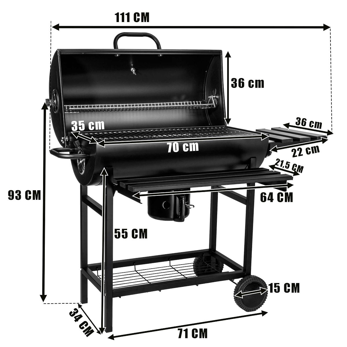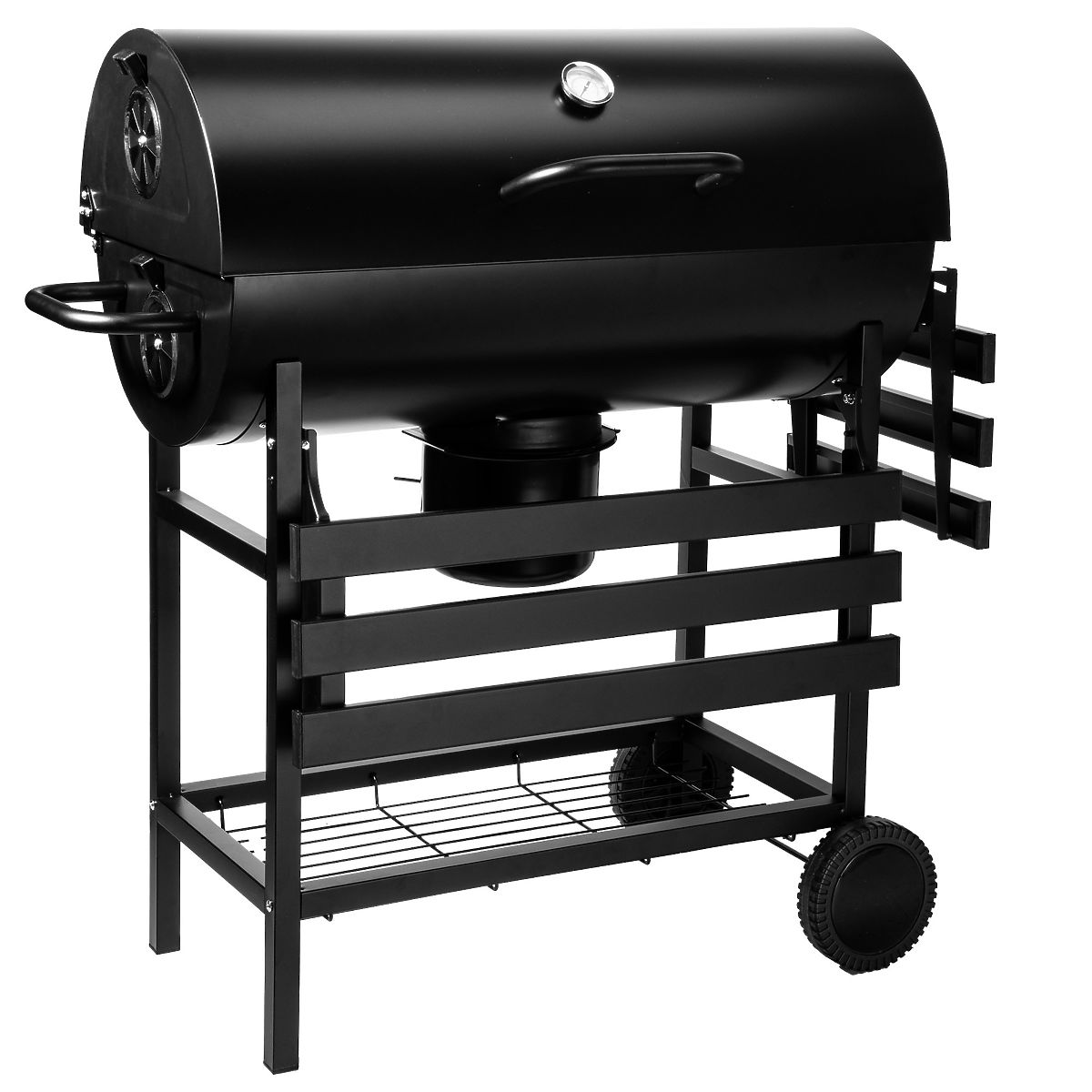 Barel ponúka nielen veľký grilovací priestor, ale aj praktické riešenia uľahčujúce grilovanie. Dve kovové, skladacie police po stranách sú ideálnym miestom pre korenie, riad alebo iné potrebné príslušenstvo. Vďaka dvom vetracím otvorom, umiestneným na ľavej strane a na veku, máte plnú kontrolu nad prúdením vzduchu, čo umožňuje presné regulovanie teploty vo vnútri grilu.