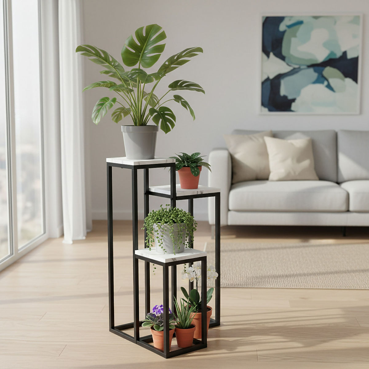 Stojan na kvety Munir Biely Mramor je elegantným a funkčným doplnkom, ktorý zmení váš interiér. Vďaka trom úrovniam získate viac miesta pre rastliny, dekorácie a doplnky, a zároveň poriadok a estetiku v dome. Minimalistický dizajn s efektom bieleho mramoru a stabilnou, kovovou základňou v čiernej farbe robí stojan ideálnym pre moderné, loftové a klasické aranžmány.