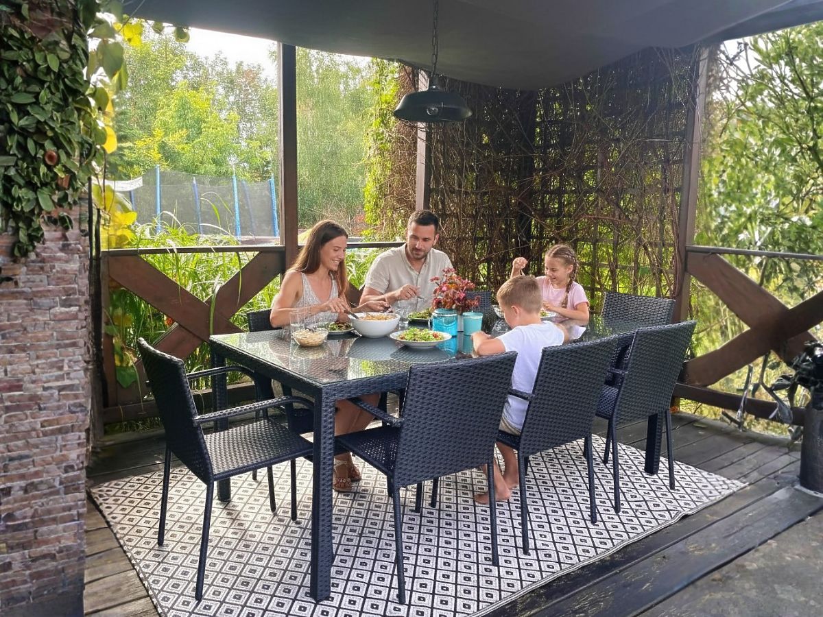 Záhradný nábytok SOTTILE je ideálnym riešením pre tých, ktorí si cenia eleganciu, pohodlie a trvanlivosť záhradného nábytku. Jedálenská súprava určená pre 8 osôb poskytuje vynikajúce podmienky na organizovanie stretnutí s blízkymi, spája neobyčajné pohodlie s jedinečným dizajnom. Každý prvok záhradnej súpravy je vyrobený z vysoko kvalitného technoratanu, čo nielen zaisťuje jeho dlhú životnosť a odolnosť voči škodlivým vplyvom počasia, ale aj umožňuje jednoduchú údržbu. Skvelá precíznosť spracovania podčiarkuje luxusný charakter nábytku, vďaka čomu sa technoratanový nábytok SOTTILE stáva nádhernou ozdobou každého vonkajšieho priestoru. Stôl so stoličkami je odolný voči dažďu a UV žiareniu, čo zaručuje, že si zachovajú svoj estetický vzhľad po mnoho rokov, stávajúc sa nepostrádateľným prvkom vybavenia každej záhrady, terasy alebo patia. Farba súpravy SOTTILE: čierna – jednoliata, jemne pruhovaná štruktúra. Pletenina: technoratan 7-8mm x 1,2mm. Konštrukcia nábytku: stôl – hliník, stoličky – oceľ. Súprava sa skladá z 9 prvkov: 1 x stôl: dĺžka: 200 cm, šírka: 100 cm, výška: 74 cm, sklenená, priehľadná doska vyrobená z 5 mm bezpečnostného skla, položená na technoratanovej pletenine. 8 x stoličky: šírka: 56 cm, hĺbka: 50 cm, výška: 84 cm, výška od podlahy k sedáku: 44 cm, výška operadla od sedáku: 43 cm, šírka sedáku: 40 cm, hĺbka sedáku: 43 cm. Súprava je zasielaná na 1 palete o rozmeroch 120x80x210 cm, váha 80 kg. Stoličky možno po vybratí z krabíc ihneď používať. Stoličky sú stohovateľné (možnosť vkladania jednej do druhej), čo uľahčuje skladovanie a nábytok nezaberá veľa miesta. Stôl je určený na jednoduchú, samostatnú montáž podľa priloženého návodu. Sklenená doska stola je upevnená na silikónových prísavkách, ktoré ju chránia pred posúvaním. Možnosť zakúpenia vankúšov na stoličky tu. Technoratan je odolný voči škodlivým vplyvom počasia, avšak pre ešte dlhšie zachovanie nemenného vzhľadu nábytku odporúčame zakúpiť ochranný kryt. Kryt v tmavo šedej farbe je jednodielny a má dole sťahovaciu šnúrku. Všetky kryty sú šité na zákazku a doba realizácie je cca 14 pracovných dní. Predstavte si záhradný nábytok, ktorý prekračuje vaše očakávania v každom ohľade – od odolnosti po dizajn. To je BELLO GIARDINO, kde každý detail má význam a luxus sa stretáva s funkčnosťou: Nepominuteľná kvalita: Náš syntetický ratan je zárukou, že nábytok vydrží roky, bez toho aby stratil na kráse či trvanlivosti. Odolnosť voči počasiu: Náš nábytok čelí najťažším poveternostným podmienkam, od spaľujúceho slnka po mrazivé zimy, zostávajúc stále krásny. Luxusné pohodlie: Silné, mäkké vankúše pozývajú k relaxácii, ponúkajú pohodlie, ktoré je ťažké nájsť inde. Ľahkosť a pevnosť: Hliníková konštrukcia spája to najlepšie z oboch svetov – je ľahká, ale mimoriadne stabilná. Dizajn, ktorý očarí: Každý prvok nášho nábytku bol navrhnutý s ohľadom na estetiku a funkčnosť, aby sa hodil do každého prostredia. Či už ste milovníkom minimalizmu, alebo si ceníte bohaté, elegantné aranžmány, náš nábytok splní vaše očakávania, prekračujúc hranice bežnej funkčnosti a estetiky. Zaisťujeme, že aj tí najodolnejší zákazníci neodolajú pohodliu a štýlu, ktorý ponúka BELLO GIARDINO. Urobte zo svojej záhrady, terasy alebo balkóna oázu relaxácie a elegancie, ktorú ste vždy chceli mať. Nečakajte, objavte BELLO GIARDINO už dnes a premeňte svoje vonkajšie priestory na miesta, o akých ste vždy snívali. Fotografie nábytku od našich zákazníkov: