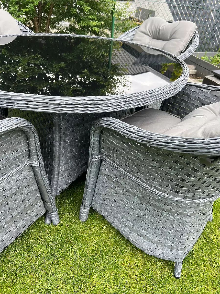 Jedálenská súprava MODERNO je kvintesenciou moderného dizajnu a inovatívneho prístupu k vybaveniu interiérov. Predstavuje neotrelý dizajn, ktorý sa odlišuje od štandardných riešení a poskytuje nielen estetiku, ale aj bezkonkurenčnú trvanlivosť vďaka použitiu vysoko kvalitného syntetického ratanu. Absolútna odolnosť voči poveternostným vplyvom robí tento set ideálnou voľbou ako pre interiéry, tak pre vonkajšie priestory. Voľbou setu MODERNO investujete do nábytku, ktorý nielen krásne vyzerá, ale je tiež prispôsobený na dlhodobé používanie, spĺňajúci očakávania najnáročnejších zákazníkov hľadajúcich jedinečné spojenie funkčnosti, trvanlivosti a súčasného štýlu. Farba setu: sivý melír, nejednotný Farba vankúšov: tmavosivá Pletenie: plochý technoratan 17 mm x 1,2 mm a okrúhly technoratan, hladká štruktúra Konštrukcia: oceľová Set zložený z 5 prvkov: 4 x kreslo: šírka: 56 cm hĺbka: 70 cm výška: 81 cm 1 x stôl (so sklenenou čiernou doskou z 5mm bezpečnostného skla): priemer: 120 cm výška: 74 cm Ďalšie rozmery: Výška sedadla kresla: 38 cm + 5 cm vankúš Výška operadla od sedadla: 50 cm Šírka podrúčok a operadla: 5 cm Šírka a hĺbka sedadla: 52 x 52 cm Set je zasielaný na 1 palete o rozmeroch 120x100x210 cm, hmotnosť 70 kg Vankúše v tmavosivej farbe na sedadlá v cene setu (4 ks) Všetky majú snímateľné poťahy na zips, vyrobené z outdoorového materiálu (100% polyester), ktoré možno prať pri nízkych teplotách. Poťahy na vankúše sú ušité z vysoko kvalitnej tkaniny pokrytej teflónom, ktorý ich chráni pred vlhkosťou. Výplň vankúšov je vyrobená z vysoko kvalitnej čalúnnickej peny (stredne tvrdé - T25), ktorá zabraňuje deformáciám. Hrúbka vankúšov: 5 cm. Možnosť ušitia vankúšov na individuálnu objednávku k tomuto setu: https://www.bg-meble.pl/pl/p/Usluga-Krawiecka-Poduszki-Na-Zamowienie-/742 Možnosť ušitia poťahov na vankúše na individuálnu objednávku k tomuto setu: https://www.bg-meble.pl/pl/p/Usluga-Krawiecka-Poszewki-Na-Zamowienie/743 Pre dlhšie zachovanie nemenného vzhľadu nábytku odporúčame zakúpiť ochranný kryt. Kryt v tmavosivej farbe je jednodielny a má na spodnej strane sťahovaciu šnúrku. Všetky kryty sú šité na zákazku a doba realizácie je cca 14 pracovných dní. Predstavte si záhradný nábytok, ktorý prekračuje vaše očakávania vo všetkých smeroch – od odolnosti po dizajn. To je BELLO GIARDINO, kde každý detail má význam a luxus sa stretáva s funkčnosťou: Nepominuteľná kvalita: Náš syntetický ratan je zárukou, že nábytok vydrží roky, bez toho aby stratil na kráse alebo trvanlivosti. Odolnosť voči počasiu: Náš nábytok čelí najťažším poveternostným podmienkam, od spaľujúceho slnka po mrazivé zimy, zostávajúc stále krásny. Luxusný komfort: Silné, mäkké vankúše pozývajú k relaxácii, ponúkajúc komfort, ktorý je ťažké nájsť inde. Ľahkosť a pevnosť: Hliníková konštrukcia spája to najlepšie z oboch svetov – je ľahká, ale mimoriadne stabilná. Dizajn, ktorý očarí: Každý prvok nášho nábytku bol navrhnutý s ohľadom na estetiku a funkčnosť, aby sa hodil do každého prostredia. Či už ste milovníkom minimalizmu, alebo si ceníte bohatých, elegantných aranžmánov, náš nábytok splní vaše očakávania, prekračujúce hranice obyčajnej funkčnosti a estetiky. Zaručujeme, že aj tí najodolnejší zákazníci nebudú môcť odolať pohodliu a štýlu, ktorý ponúka BELLO GIARDINO. Urobte zo svojej záhrady, terasy alebo balkóna oázu relaxácie a elegancie, ktorú ste vždy chceli mať. Nečakajte, objavte BELLO GIARDINO už dnes a premeňte svoje vonkajšie priestory na miesta, o ktorých ste vždy snívali. Fotografie od našich zákazníkov