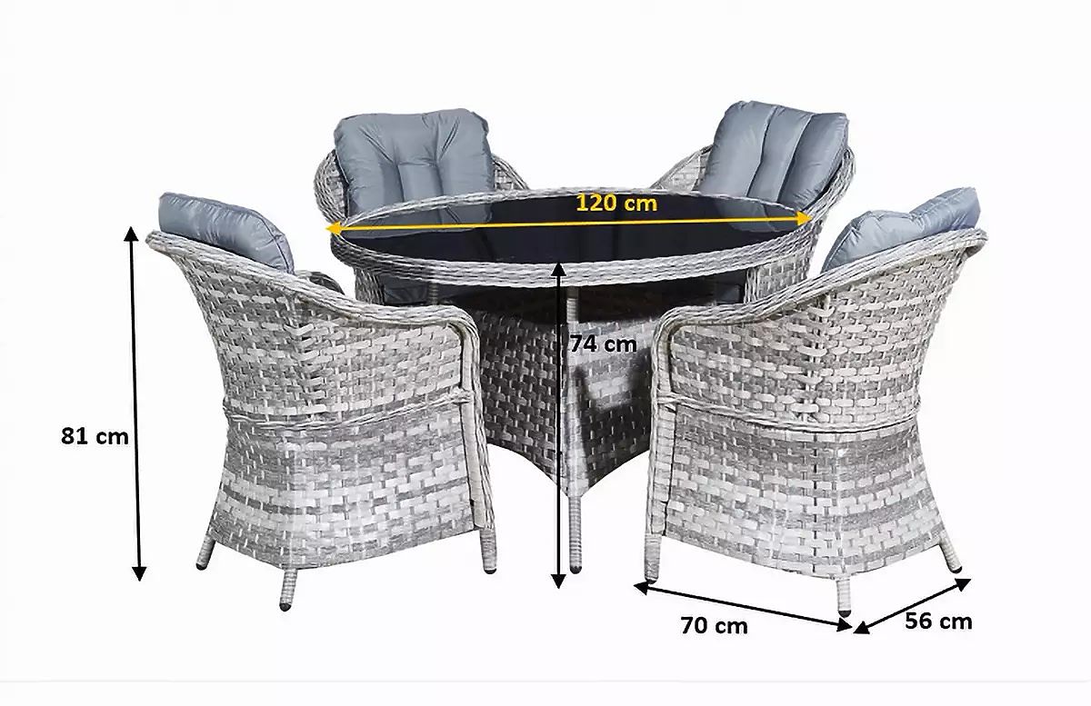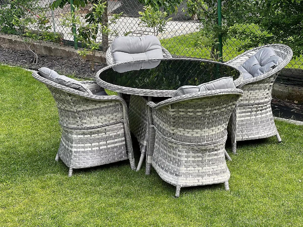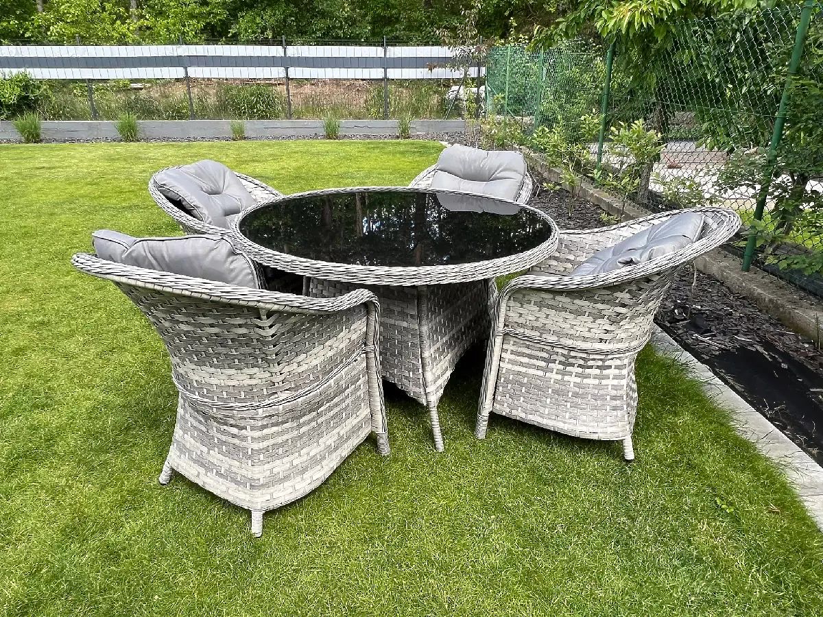 Súprava stolového nábytku MODERNO je synonymom modernosti a elegancie v usporiadaní priestoru. Vyznačuje sa neobvyklým dizajnom, ktorý sa hodí do najmodernejších trendov v dizajne a zároveň ponúka výnimočnú trvanlivosť a odolnosť vďaka použitiu najkvalitnejšieho syntetického ratanu. Kreslá a stôl z tejto kolekcie sú úplne odolné voči škodlivým vplyvom počasia, čo robí súpravu MODERNO skvelou voľbou ako pre vnútorné, tak pre vonkajšie použitie. Táto výnimočná súprava nábytku bola navrhnutá s ohľadom na najnáročnejších zákazníkov, ktorí hľadajú kombináciu funkčnosti, trvanlivosti a moderného dizajnu. Farba súpravy: svetlosivý melír, nejednotná Farba vankúšov: tmavosivá Pletenina: plochý technoratan 17mm x 1,2mm a okrúhly technoratan, hladká štruktúra Konštrukcia: oceľová Súprava sa skladá z 5 prvkov: 4 x kreslo: šírka: 56 cm hĺbka: 70 cm výška: 81 cm 1 x stôl (so sklenenou čiernou doskou z 5mm bezpečnostného skla): priemer: 120 cm výška: 74 cm Ďalšie rozmery: Výška sedadla kresla: 38 cm + 5 cm vankúš Výška operadla od sedadla: 50 cm Šírka podrúčok a operadla: 5 cm Šírka a hĺbka sedadla: 52 x 52 cm Súprava je zasielaná na 1 palete o rozmeroch 120x100x210 cm, hmotnosť 70 kg Vankúše v tmavosivej farbe na sedadlá v cene súpravy (4 ks) Všetky majú odnímateľné poťahy na zips, vyrobené z outdoorového materiálu (100% polyester), ktoré možno prať pri nízkych teplotách. Poťahy na vankúše sú ušité z vysoko kvalitnej tkaniny potiahnutej teflónom, ktorý ich chráni pred vlhkosťou. Výplň vankúšov je vyrobená z vysoko kvalitnej čalúnnickej peny (stredne tvrdá - T25), ktorá zabraňuje deformáciám. Hrúbka vankúšov: 5 cm. Možnosť ušitia vankúšov na zákazku pre túto súpravu: https://www.bg-meble.pl/pl/p/Usluga-Krawiecka-Poduszki-Na-Zamowienie-/742 Možnosť ušitia poťahov na vankúše na zákazku pre túto súpravu: https://www.bg-meble.pl/pl/p/Usluga-Krawiecka-Poszewki-Na-Zamowienie/743 Aby si nábytok udržal svoj vzhľad čo najdlhšie, odporúčame zakúpiť ochranný kryt. Kryt v tmavosivej farbe je jednodielny a má dole sťahovaciu šnúrku. Všetky kryty sú šité na zákazku a doba realizácie je cca 14 pracovných dní. Predstavte si záhradný nábytok, ktorý prekoná vaše očakávania vo všetkých ohľadoch – od odolnosti po dizajn. To je BELLO GIARDINO, kde každý detail má význam a luxus sa stretáva s funkčnosťou: Nepominuteľná kvalita: Náš syntetický ratan je zárukou, že nábytok vydrží roky, bez toho aby stratil na kráse či trvanlivosti. Odolnosť voči počasiu: Náš nábytok čelí najťažším poveternostným podmienkam, od spaľujúceho slnka po mrazivé zimy, zostávajúc stále krásny. Luxusný komfort: Silné, mäkké vankúše pozývajú k relaxácii, ponúkajúc komfort, ktorý je ťažké nájsť inde. Ľahkosť a pevnosť: Hliníková konštrukcia spája to najlepšie z oboch svetov – je ľahká, ale mimoriadne stabilná. Dizajn, ktorý očarí: Každý prvok nášho nábytku bol navrhnutý s ohľadom na estetiku a funkčnosť, aby sa hodil do každého prostredia. Či už ste milovníkom minimalizmu, alebo si ceníte bohatých, elegantných aranžmánov, náš nábytok splní vaše očakávania, prekračujúc hranice bežnej funkčnosti a estetiky. Zaručujeme, že aj tí najodolnejší zákazníci neodolajú pohodliu a štýlu, ktorý ponúka BELLO GIARDINO. Urobte zo svojej záhrady, terasy alebo balkóna oázu relaxácie a elegancie, ktorú ste vždy chceli mať. Nečakajte, objavte BELLO GIARDINO ešte dnes a premeňte svoje vonkajšie priestory na miesta, o ktorých ste vždy snívali. Fotografie od našich zákazníkov