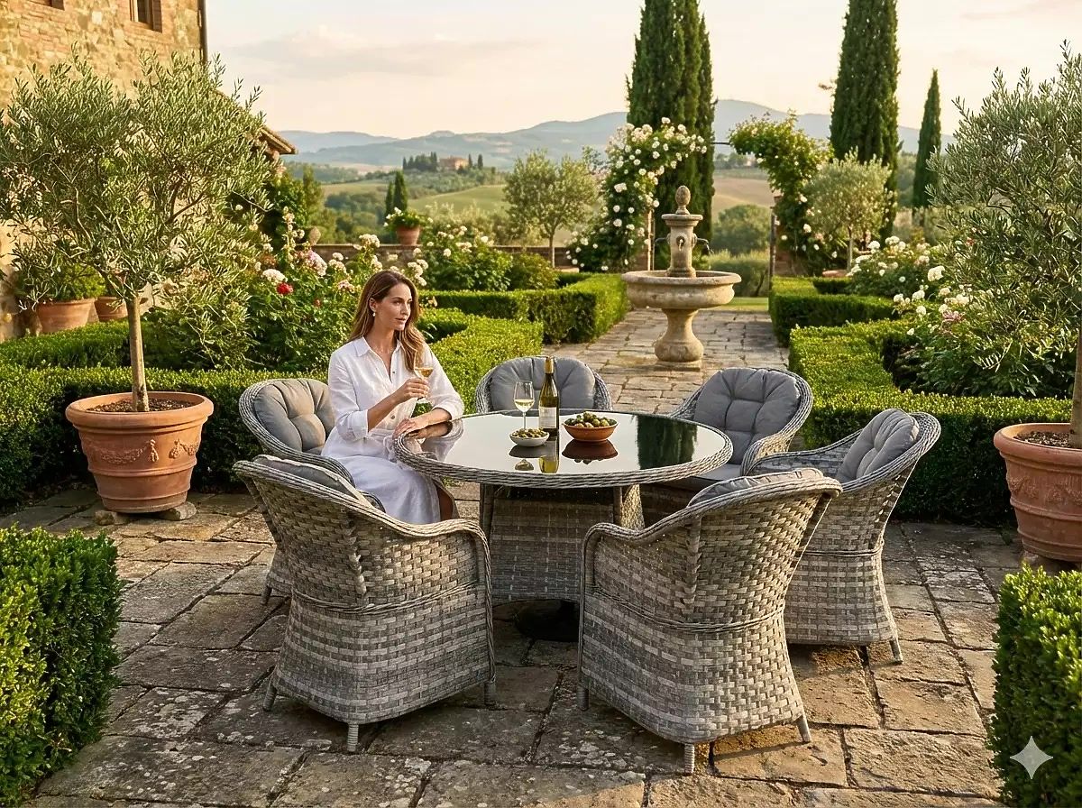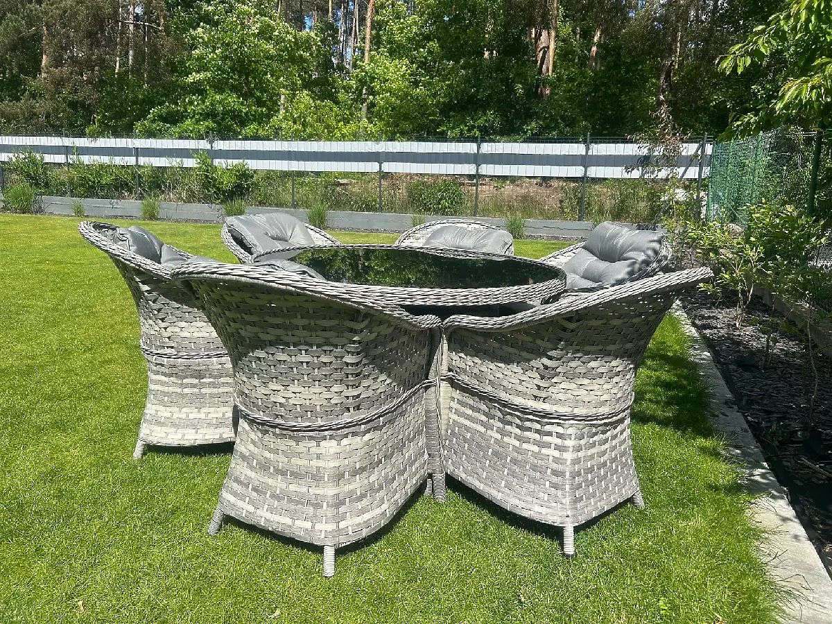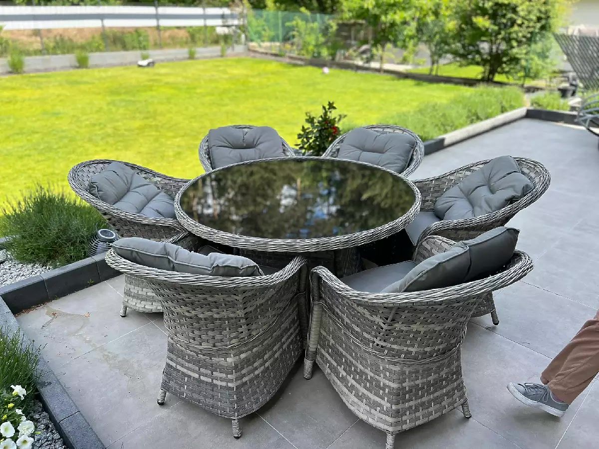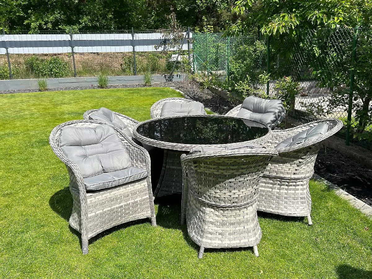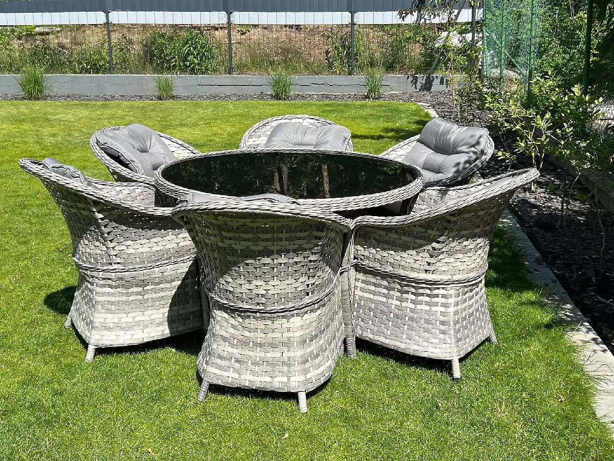 Súprava jedálenského nábytku MODERNO je esenciou moderného dizajnu a inovácie v oblasti vonkajšieho a vnútorného nábytku. Ponúka jedinečné spojenie najnovšieho dizajnu s funkčnosťou, táto súprava sa stáva srdcom každého priestoru. Kreslá a stôl z tejto kolekcie sú vyrobené z vysoko kvalitného syntetického ratanu, čo zaisťuje absolútnu odolnosť voči škodlivým vplyvom počasia, čo garantuje ich dlhú životnosť a trvanlivosť. Výber materiálov najvyššej triedy robí MODERNO GRANDE ideálnym pre najnáročnejších zákazníkov, ktorí hľadajú nielen krásu, ale aj praktickosť a odolnosť vo svojom jedálenskom nábytku. Táto súprava je ideálnym riešením pre tých, ktorí chcú spojiť eleganciu s modernosťou vo svojom životnom priestore. Farba súpravy: svetlosivý melír, nejednotný Farba vankúšov: tmavosivá Výplet: plochý technoratan 17mm x 1,2mm a guľatý technoratan, hladká štruktúra Konštrukcia: oceľová Súprava sa skladá zo 7 prvkov: 6 x kreslo: šírka: 56 cm hĺbka: 70 cm výška: 81 cm 1 x stôl (so sklenenou čiernou doskou z 5mm bezpečnostného skla): priemer: 120 cm výška: 74 cm Ďalšie rozmery: Výška sedadla kresla: 38 cm + 5 cm vankúš Výška operadla od sedadla: 50 cm Šírka podrúčok a operadla: 5 cm Šírka a hĺbka sedadla: 52 x 52 cm Súprava je zasielaná na 1 palete o rozmeroch 145x125x210 cm, váha 90 kg Vankúše v tmavosivej farbe na sedadlá v cene súpravy (6 ks) Všetky majú snímateľné poťahy na zips, vyrobené z outdoorového materiálu (100% polyester), ktoré možno prať pri nízkych teplotách. Poťahy na vankúše sú ušité z vysoko kvalitnej tkaniny potiahnutej teflónom, ktorý ich chráni pred vlhkosťou. Výplň vankúšov je vyrobená z vysoko kvalitnej čalúnickej peny (stredne tvrdá - T25), ktorá zabraňuje deformáciám. Hrúbka vankúšov: 5 cm. Možnosť ušitia vankúšov na individuálnu objednávku k tejto súprave: https://www.bg-meble.pl/pl/p/Usluga-Krawiecka-Poduszki-Na-Zamowienie-/742 Možnosť ušitia poťahov na vankúše na individuálnu objednávku k tejto súprave: https://www.bg-meble.pl/pl/p/Usluga-Krawiecka-Poszewki-Na-Zamowienie/743 Pre ešte dlhšie zachovanie nezmeneného vzhľadu nábytku odporúčame zakúpiť ochranný kryt. Kryt v tmavosivej farbe je jednodielny a má dole sťahovaciu šnúrku. Všetky kryty sú šité na objednávku a doba realizácie je cca 14 pracovných dní. Predstavte si záhradný nábytok, ktorý prekračuje vaše očakávania vo všetkých smeroch – od odolnosti po dizajn. Tu je BELLO GIARDINO, kde každý detail má význam a luxus sa stretáva s funkčnosťou: Nezmeniteľná kvalita: Náš syntetický ratan je zárukou, že nábytok vydrží roky, bez toho aby stratil na kráse či trvanlivosti. Odolnosť voči počasiu: Náš nábytok čelí najťažším poveternostným podmienkam, od spaľujúceho slnka po mrazivé zimy, zostávajúci stále krásny. Luxusný komfort: Silné, mäkké vankúše pozývajú k relaxácii, ponúkajúci komfort, ktorý je ťažké nájsť inde. Ľahkosť a odolnosť: Hliníková konštrukcia spája to najlepšie z oboch svetov – je ľahká, ale mimoriadne stabilná. Dizajn, ktorý očarí: Každý prvok nášho nábytku bol navrhnutý s ohľadom na estetiku a funkčnosť, aby sa hodil do každého prostredia. Či už ste milovníkom minimalizmu, alebo si ceníte bohatých, elegantných aranžmánov, náš nábytok splní vaše očakávania, prekračujúce hranice bežnej funkčnosti a estetiky. Zaisťujeme, že aj tí najodolnejší zákazníci neodolajú pohodliu a štýlu, ktorý ponúka BELLO GIARDINO. Urobte zo svojej záhrady, terasy alebo balkóna oázu relaxácie a elegancie, ktorú ste vždy chceli mať. Nečakajte, objavte BELLO GIARDINO ešte dnes a premeňte svoje vonkajšie priestory na miesta, o ktorých ste vždy snívali.