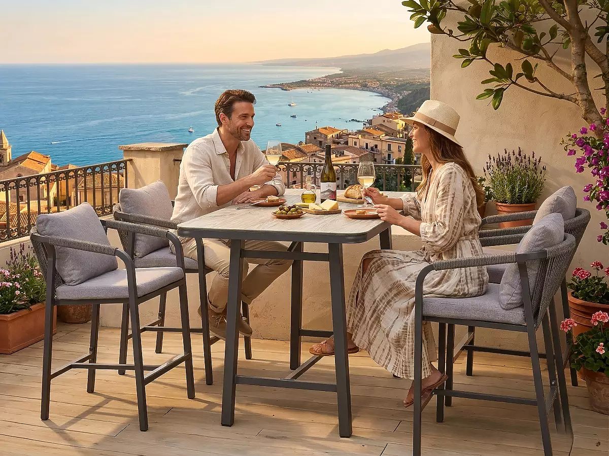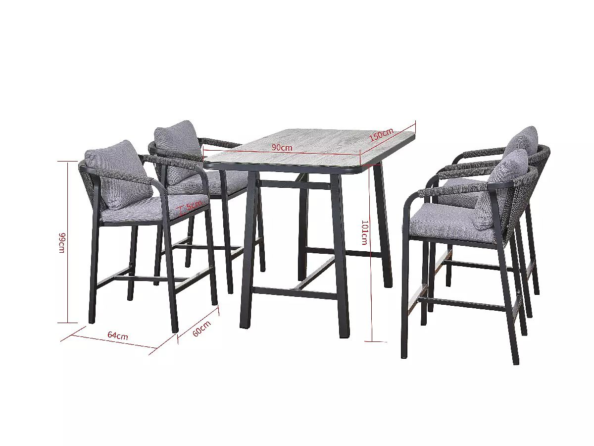 OČAKÁVANÁ DODÁVKA NA ZAČIATKU APRÍLA 2026 Súprava nábytku BREZZA je výnimočná ponuka pre tých, ktorí chcú do svojej záhrady, na terasu alebo patio vniesť modernú, klubovú atmosféru. Tento exkluzívny komplet sa vyznačuje netypickou formou pre záhradný nábytok – skladá sa z vysokého barového stola a štyroch pohodlných barových stoličiek. Je to ideálne riešenie pre oslavy letných večerov s drinkami, občerstvením alebo voľnými rozhovormi medzi priateľmi. Viacvrstvové sedadlo s penou o vhodnej hustote a mäkké operadlo zabezpečujú, že aj vysoké stoličky sa stávajú synonymom relaxácie. Veľká doska stola o rozmeroch 150 x 90 cm poskytuje dostatok miesta na riad a dekorácie, čím vytvára centrálny bod každej vonkajšej párty. Technická špecifikácia: Názov modelu: BREZZA Typ súpravy: Barová súprava (vysoký stôl + 4 barové stoličky) Rozmery stola: Dĺžka: 150 cm Šírka: 90 cm Výška: 101 cm Rozmery barovej stoličky: Šírka: 60 cm Hĺbka: 64 cm Výška: 99 cm Vankúše: Sedadlo: Hrúbka 5 cm, viacvrstvová konštrukcia zabezpečujúca trvanlivosť a pohodlie (1 cm polypropylén 350 g + 3 cm pena/guma 20D + 1 cm polypropylén 350 g). Operadlo: Výplň z mäkkej bavlny PP, ktorá sa dokonale prispôsobí chrbtu. Výberom súpravy BREZZA stavíte na neobvyklý štýl a funkčnosť, ktorá zmení charakter vášho vonkajšieho priestoru. Je to nábytok, ktorý vyzýva k spoločnému tráveniu času na čerstvom vzduchu, spájajúci voľnosť barovej atmosféry s domácim pohodlím. Vytvorte si svoju súkromnú relaxačnú zónu, ktorá očarí hostí a stane sa obľúbeným miestom letných stretnutí.