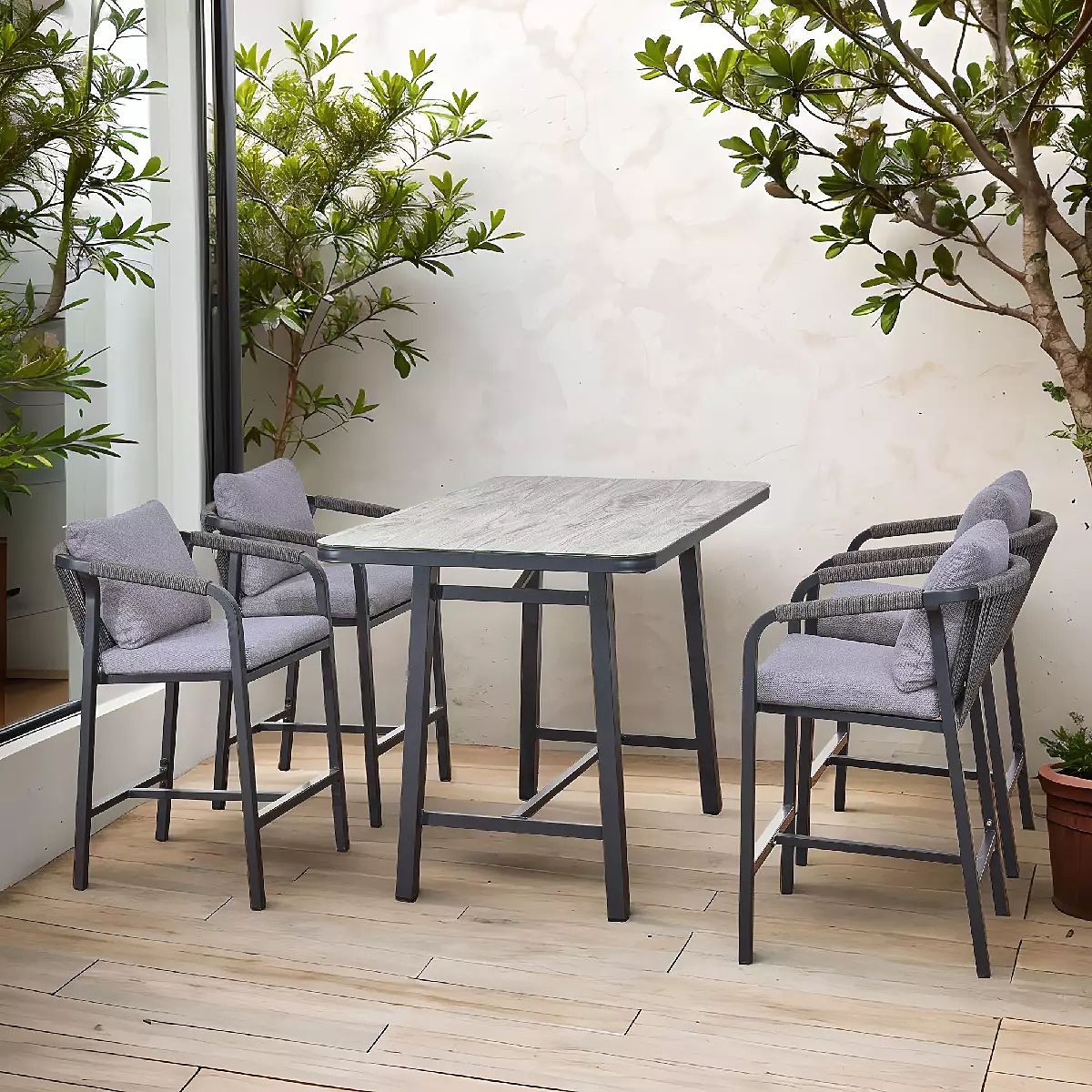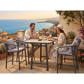 Súprava záhradného nábytku (4 barové stoličky + vysoký stôl) BREZZA sivá