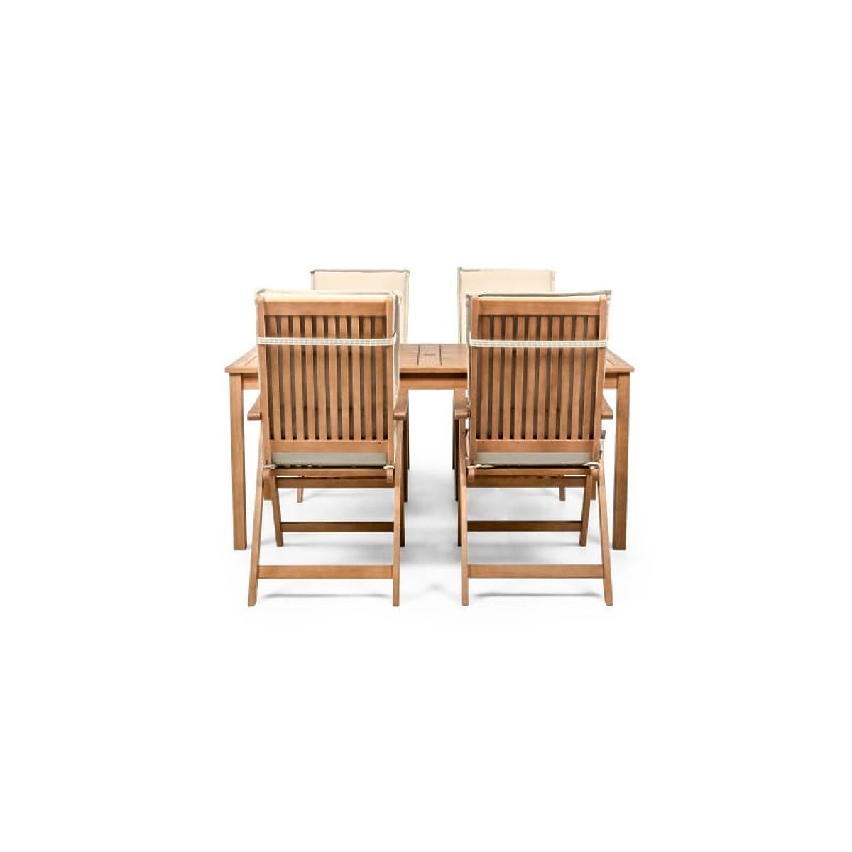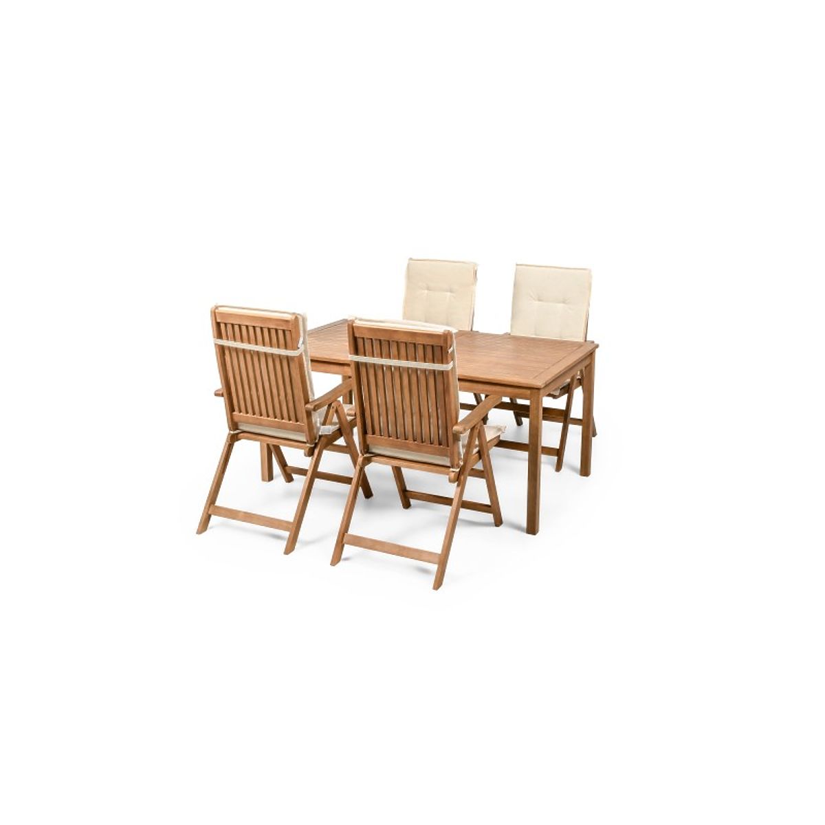 Lukahome.sk » Záhradný nábytok / Záhradné sety / Záhradný set Familis stôl 160 cm + 4 stoličky s nastaviteľnými operadlami a krémovými vankúšmi, drev