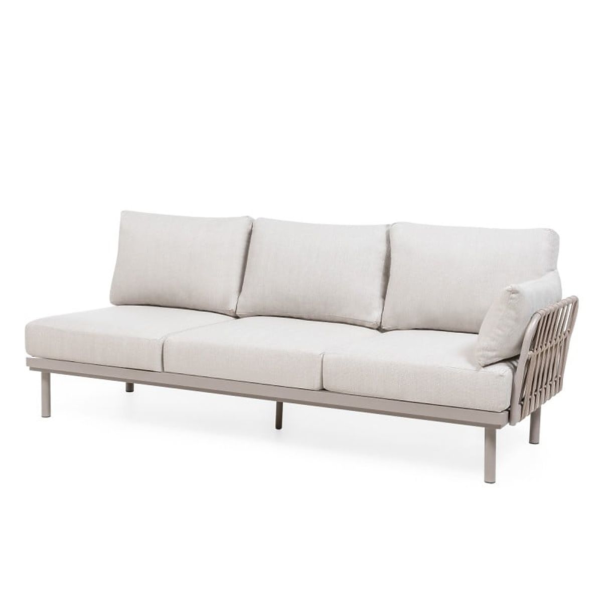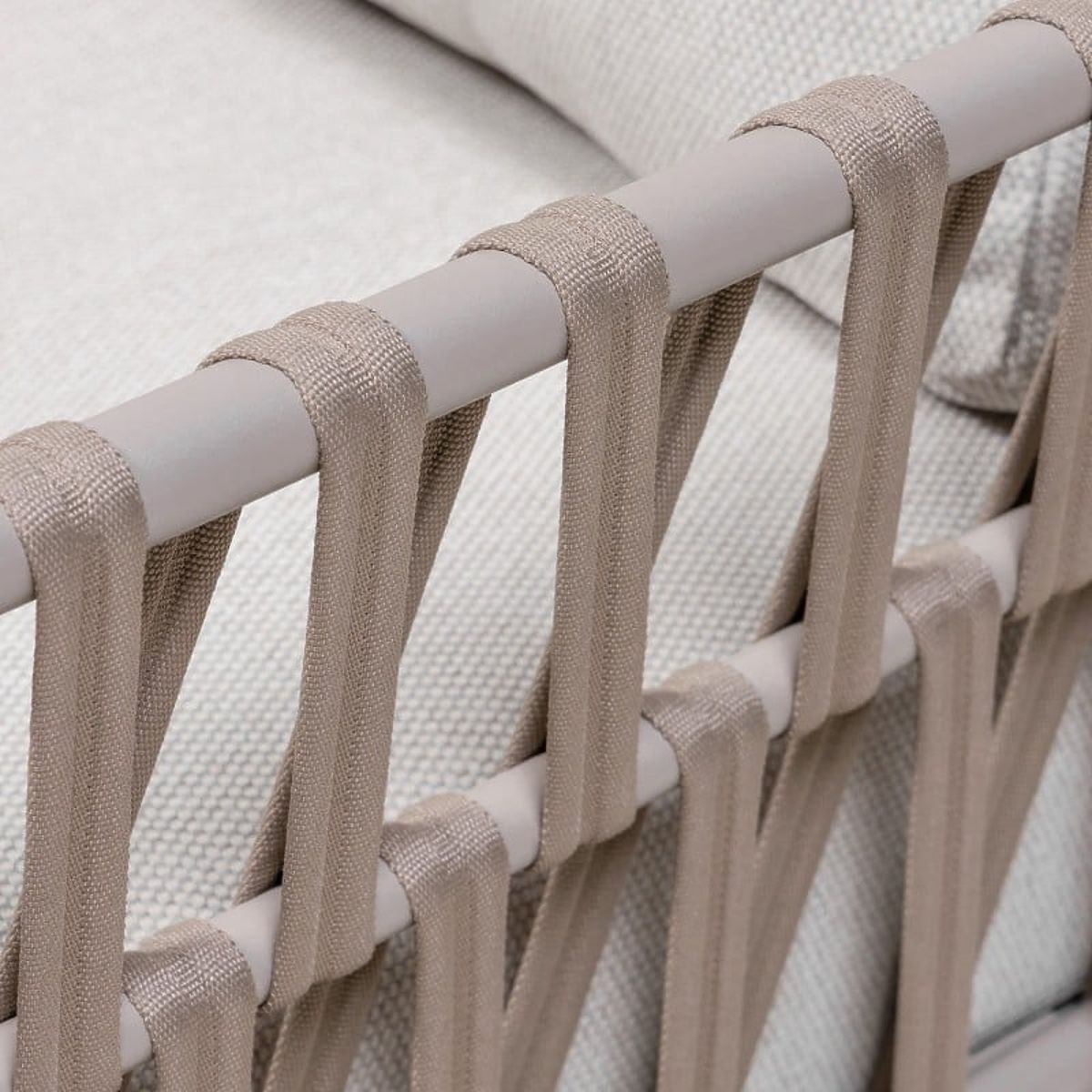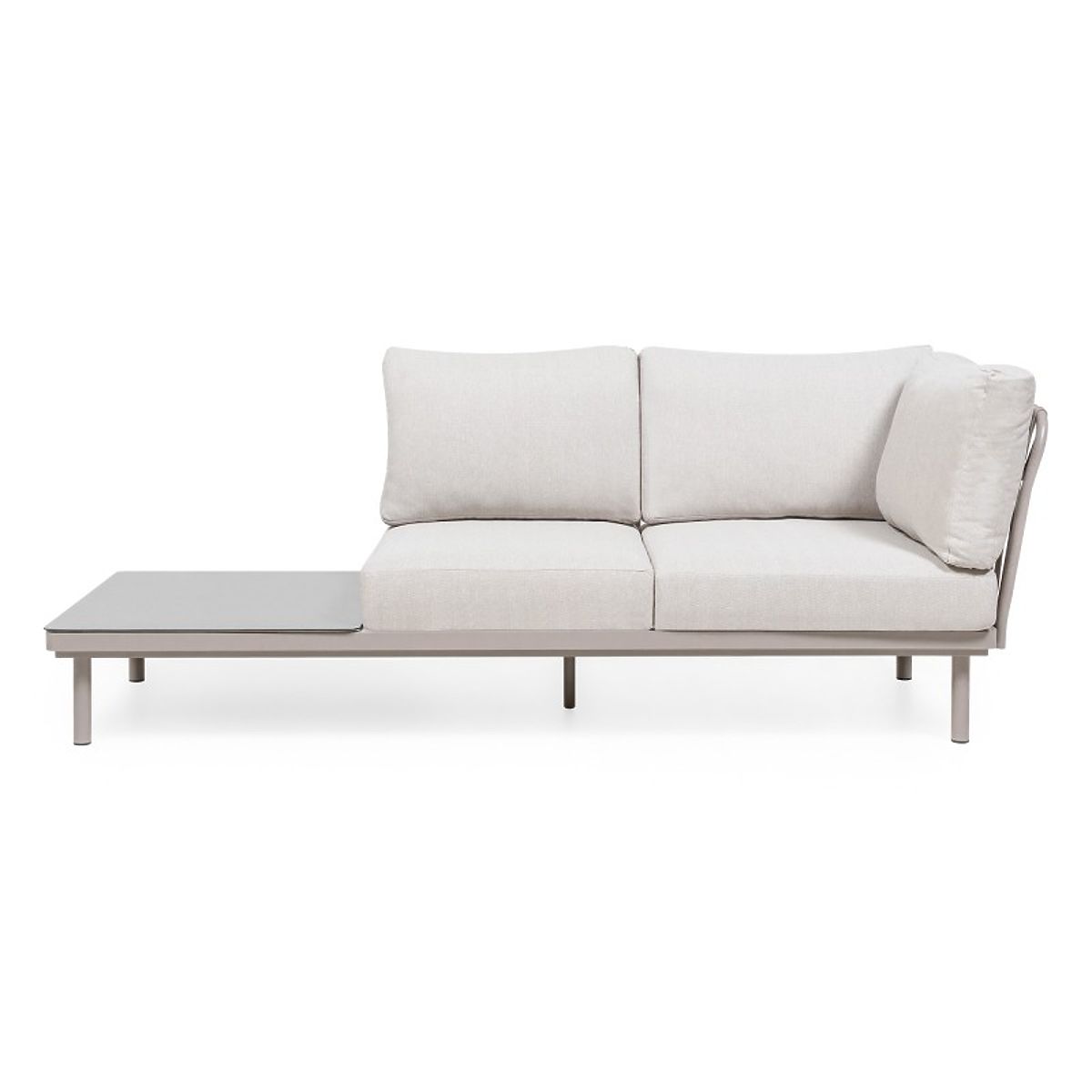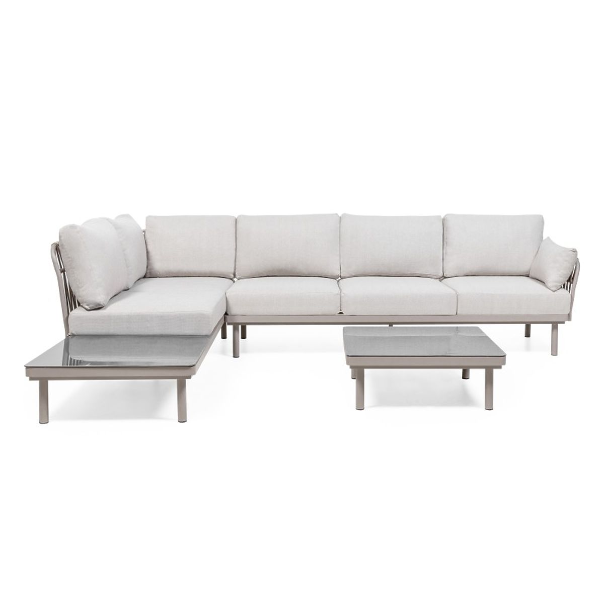 Rohová sedačka Amarello – jemná elegancia v harmonickej forme. Hliníková konštrukcia v béžovošedom odtieni, odolné pletenie a pohodlné vankúše vytvárajú sofistikovaný priestor na oddych, doplnený praktickým stolíkom a bočnou poličkou.