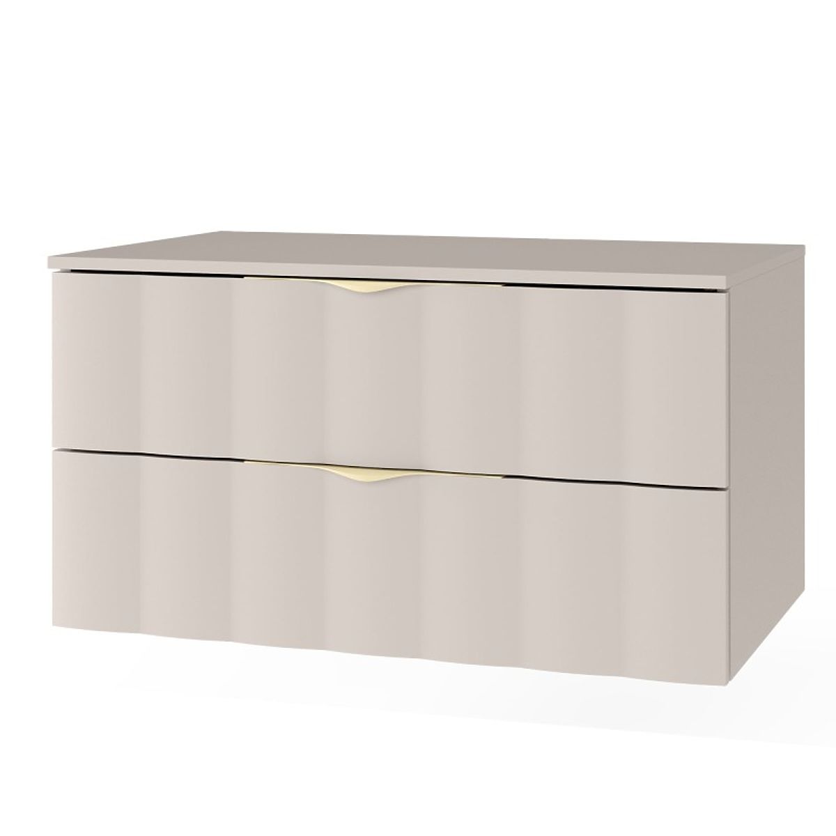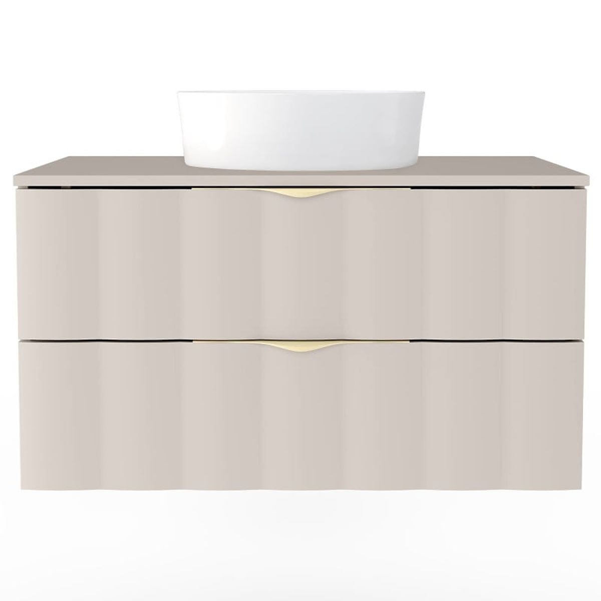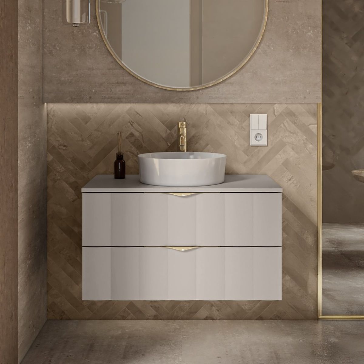 Lukahome.sk » Kúpeľňa a WC / Kúpeľňové skrinky / Skrinka pod umývadlo na dosku Omi 80 cm, vlnitý čelný panel, zlaté úchyty, kašmírová béžová